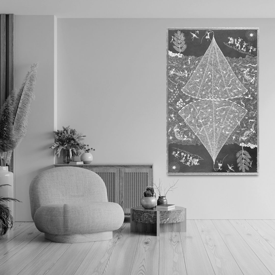 Working in acrylic on canvas or paper, Kishor Mhase draws upon a folk visual vocabulary rooted in community life and the rhythms of labour and environment. In Double Fish Net, the everyday act of fishing is transformed into a study of balance, symmetry and interdependence. The composition holds tension and harmony in equal measure, translating lived experience into a structured and resonant visual form.