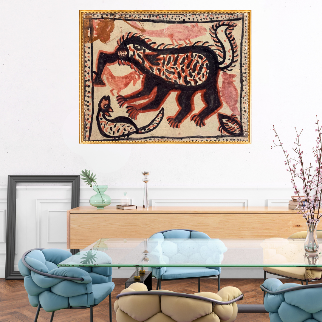 Feast of the Forest' by Sajhwa Devi shows a wild creature in motion, its body marked with rhythmic patterns that recall both the stripes of an animal and the grain of earth itself. The surrounding shapes, perhaps fish or forest beings, add to the sense of liveliness. The red and black natural pigments lend a primal energy to the scene, making it both raw and composed.