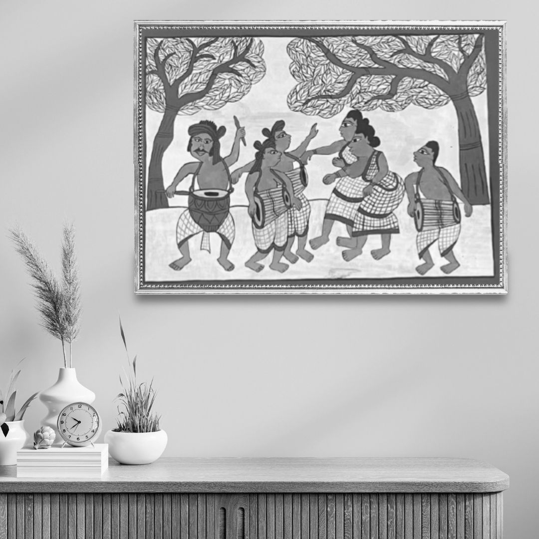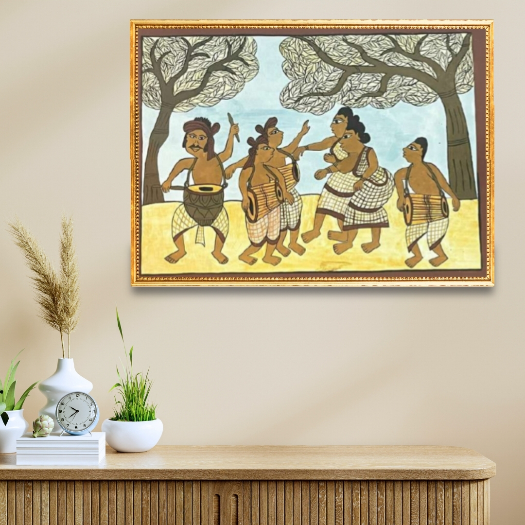 Kishor Gayen works within a folk and tribal painting tradition rooted in storytelling and collective memory. In acrylic on canvas or paper, he translates everyday rituals and seasonal gatherings into compositions that honour both detail and harmony. Festival Celebrations I stands as a vivid expression of community—an artwork where colour, pattern and shared experience converge into a unified visual celebration.