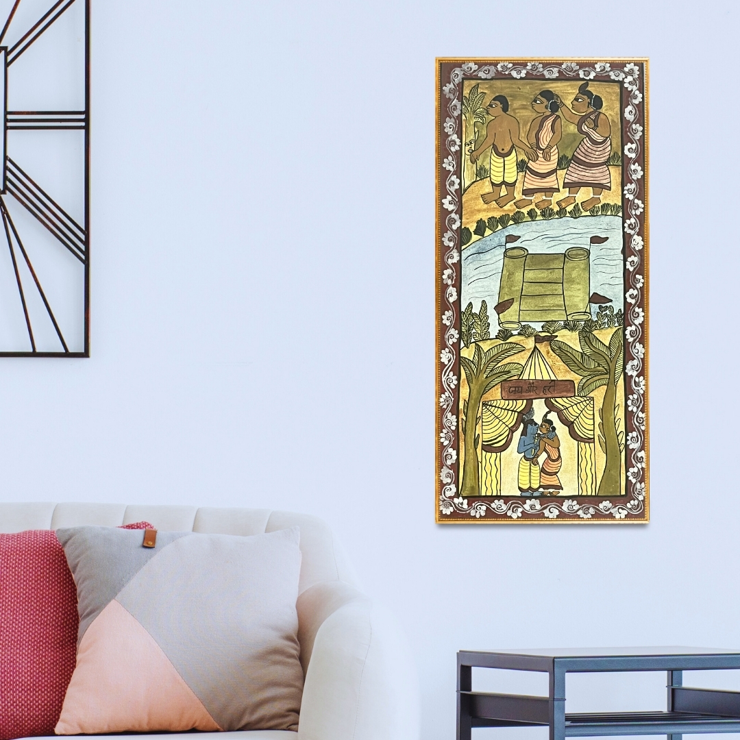 The composition stretches horizontally in the narrative spirit of traditional Paitkar painting, allowing several moments of celebration to appear within a single pictorial field. Bright colours—vermilion reds, luminous yellows, deep blues and vibrant greens—are applied in flat planes that lend clarity and vitality to the image. Patterned garments and repeating decorative motifs establish a lively cadence across the surface.