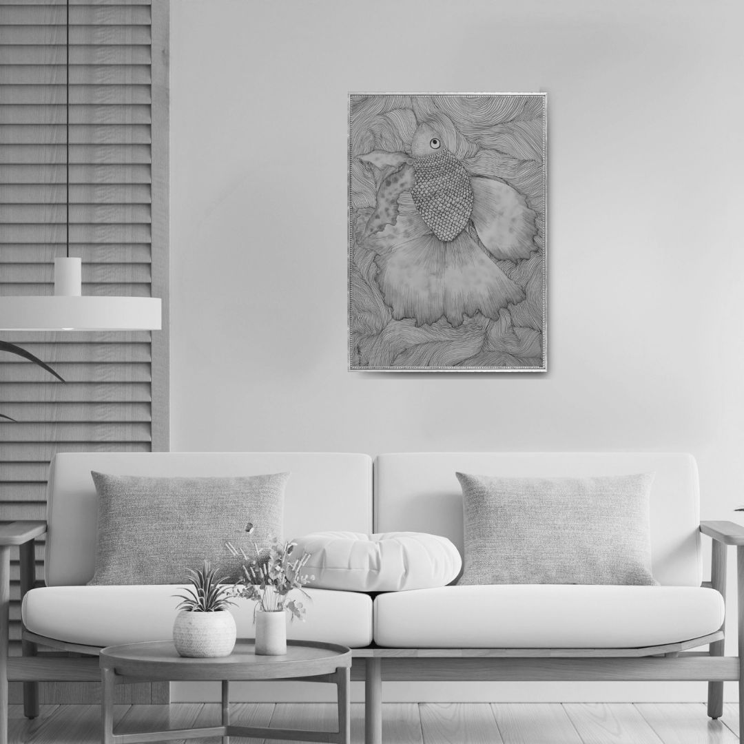 The juxtaposition of densely scaled body and expansive flowing fins creates a visual tension between containment and release that gives the composition its emotional charge. The rose and blush palette of the fins against the monochromatic wave ground makes this one of Dhurve's most striking works in terms of colour contrast and spatial presence. The undulating linework of the background is itself a complete mark-making achievement, transforming negative space into active, living form. Sandeep Dhurve's command of scale, proportion and Gond visual grammar elevates a single subject into a meditation on grace, pattern and the natural world.