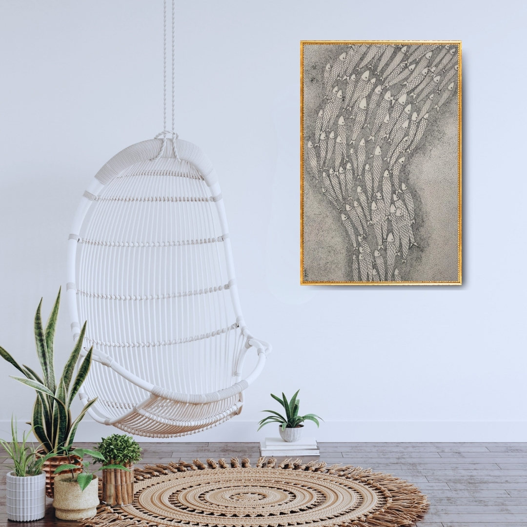 The sweeping diagonal formation of the school creates a strong compositional current that carries the eye across the entire surface without rest, making the act of looking feel like participation in the movement itself. The repetition of individually scaled fish bodies, each rendered by hand, gives the collective mass an intimacy that purely abstract pattern-making cannot achieve. The stippled dotwork ground dissolves at its centre into open space, creating a sense of genuine depth and aquatic atmosphere within a monochromatic palette. Sandeep Dhurve's work demonstrates how the Gond tradition's visual grammar of pattern and repetition can describe the natural world with both precision and feeling.