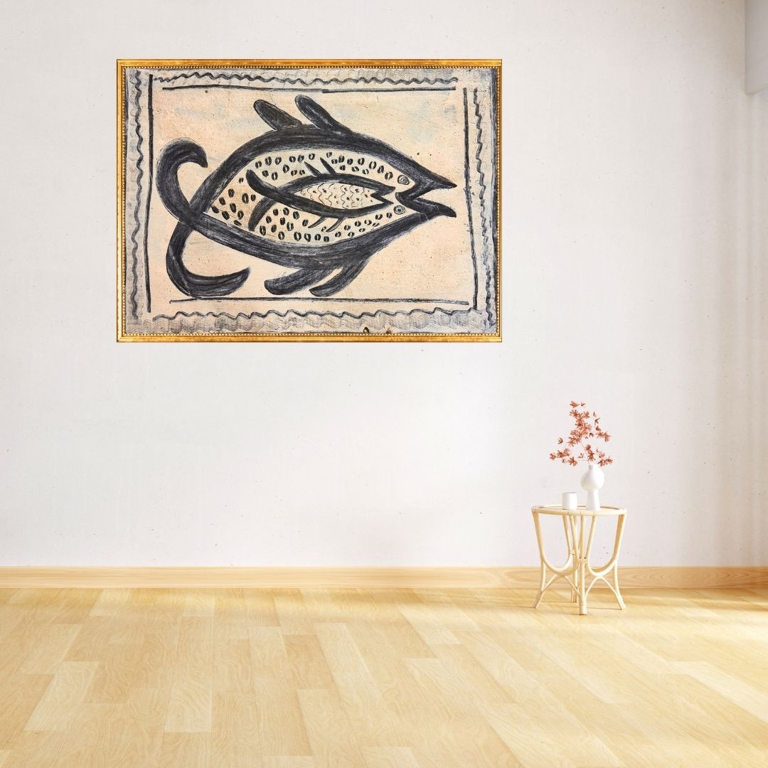 "Philomina Tirkey’s Flow of Plenty celebrates abundance through the sacred symbol of the fish, a motif of prosperity in tribal art across India. Its positioning with the larger fish overlaying and surrounding the smaller one makes it open to various interpretations. Does the painting convey abundance through the natural cycle that requires smaller fish to be eaten by bigger ones in a continouous cycle...or does it simply portray the two fish companionably swimming together even when they are of different species?