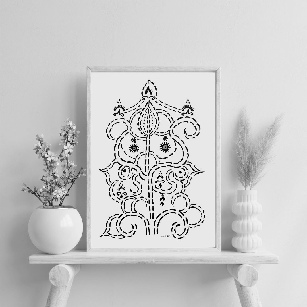 The artist uses techniques to achieve this balance. First, the empty spaces between the Godna patterns help create depth and make the form of Ganesh Ji stand out. The artist also uses different thicknesses of lines – thicker lines for the main shape of Ganesh Ji and finer lines for the Godna details, which helps the main figure stay clear while showing the delicate patterns. By repeating the Godna motifs, the artist creates a sense of rhythm and connection in the artwork, while changing the size and position of the designs adds variety. The use of only black and white colors makes the details stand out without distracting from the main figure. Finally, the artist places Ganesh Ji in the center, giving the artwork a balanced and symmetrical feel. All these techniques work together to highlight both the form of Ganesh Ji and the intricate Godna designs around it.