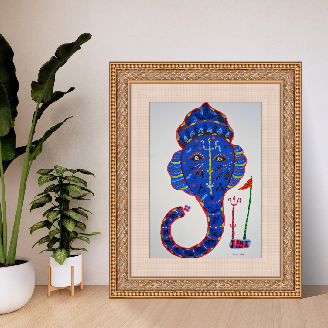 The tribal interpretation of Ganesh Ji reflects Baiga artistic identity by incorporating indigenous elements, symbolism, and vibrant, earthy colors that align with the tribe’s connection to nature and spirituality. Unlike mainstream depictions, the Baiga representation emphasizes Ganesh role as a remover of obstacles and a protector of the forest, with the artwork often featuring natural motifs and dynamic forms that reflect the tribe's reverence for the natural world and their ancestral beliefs. This unique interpretation underscores the blending of traditional Hindu iconography with the Baiga.