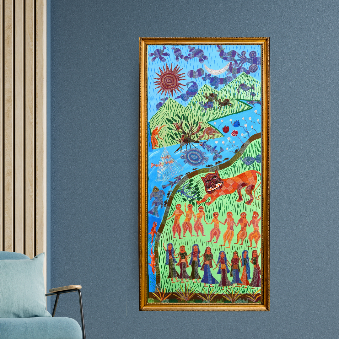 Dynamic Composition of Life and Ritual – This grand artwork manages to bring together several elements like festive tribal dance, wildlife, and daily activities like fishing to reflect the interconnectedness of community, nature, and spirituality.