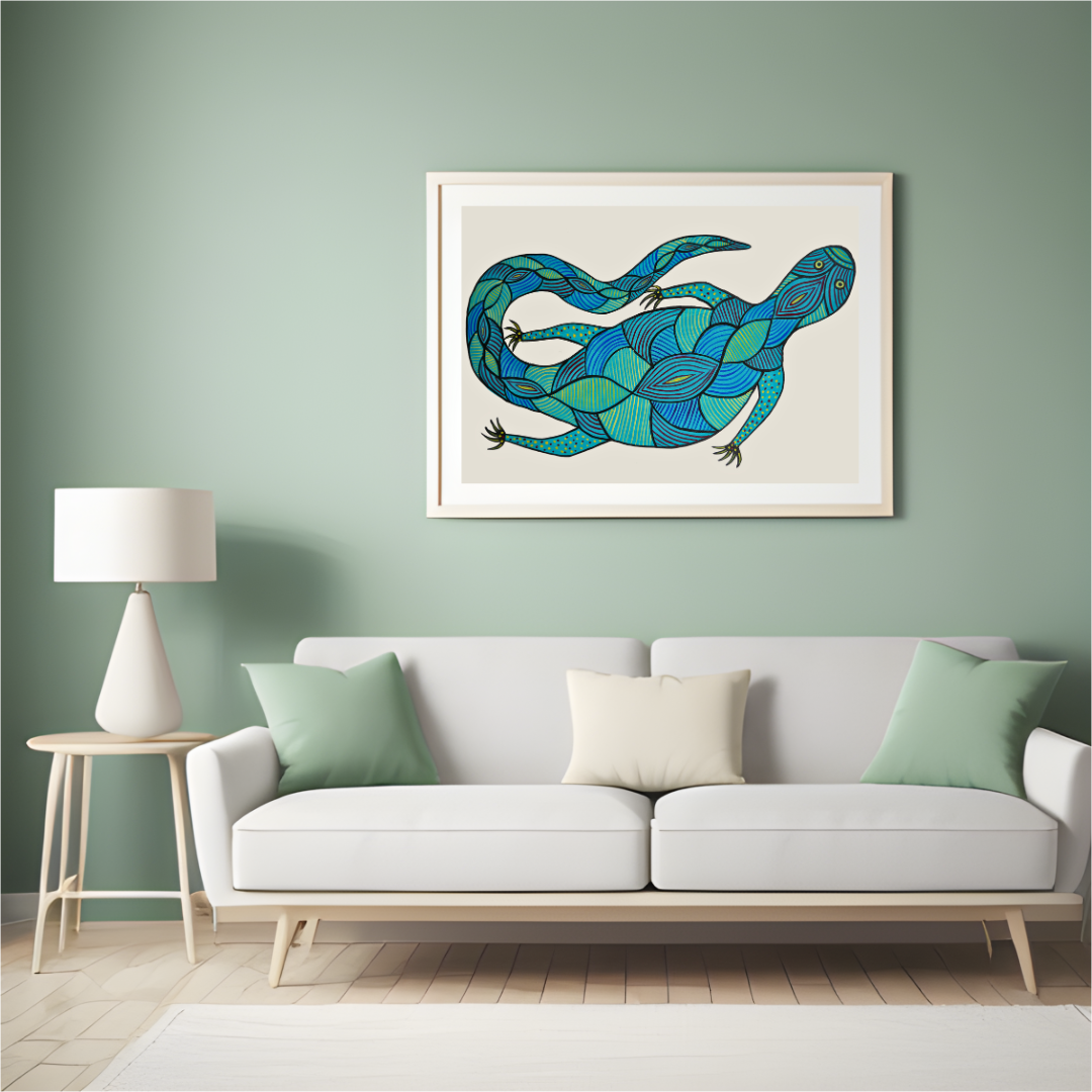 The artwork blends traditional and modern elements. The bold, flat colors and geometric patterns on the lizard’s body reflect traditional artistic styles, often characterized by simple shapes and intricate patterns to depict animals and nature. However, the artist introduces modern touches as well. The diagonal positioning of the lizard on the canvas creates a sense of movement and energy, while the use of a limited color palette, mainly shades of blue and green, gives the piece a contemporary, abstract look. The fragmented geometric design of the lizard’s body further adds a modern twist, showing a fresh approach to form and structure. Overall, the artwork beautifully combines traditional techniques with contemporary creativity.