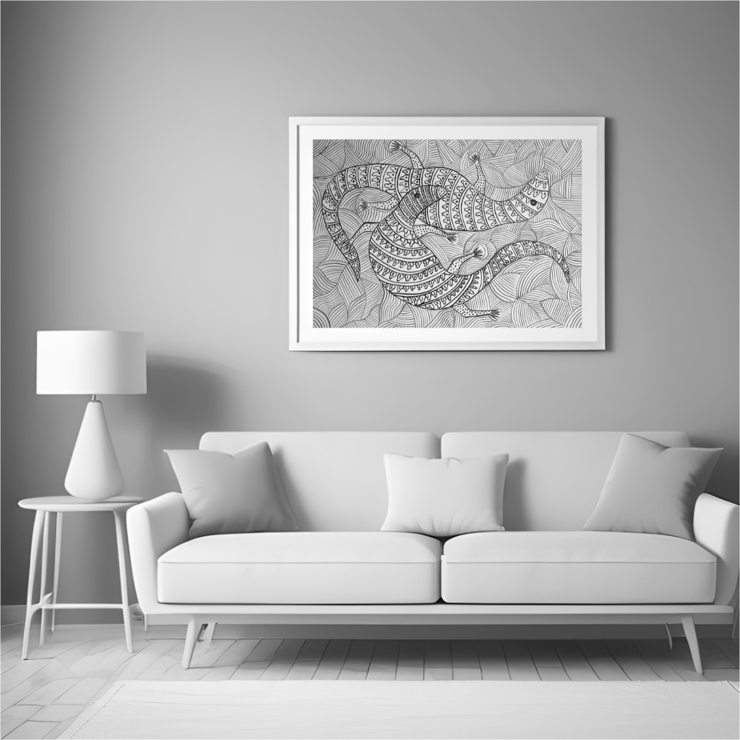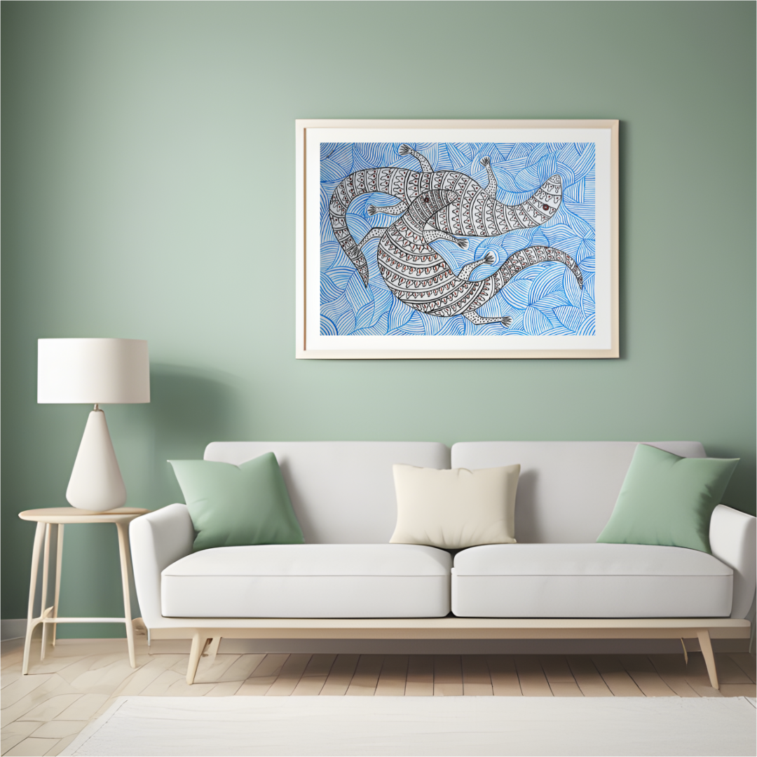 The balance between the two intertwined creatures in the artwork impacts the viewer’s perception of harmony within the natural world, especially in relation to the interdependence of animals and nature as seen in Baiga spirituality. The creatures' positioning creates a harmonious composition, symbolizing the interconnectedness of all living beings. This visual unity reflects the belief in the cyclical nature of existence, where every life form is interdependent. The intricate patterns on the creatures’ bodies further emphasize this rhythm and harmony, mirroring the cycles found in nature. The use of a limited color palette highlights the tranquil and unified essence of the artwork, reinforcing the theme of peaceful coexistence. Through this balanced composition and its symbolic elements, the artwork evokes a sense of interconnectedness, which resonates with Baiga spirituality’s deep respect for the delicate balance between animals, nature, and humans. It invites the viewer to reflect on the harmonious relationship that sustains the natural world and inspires an appreciation for the spiritual unity that governs all living beings.