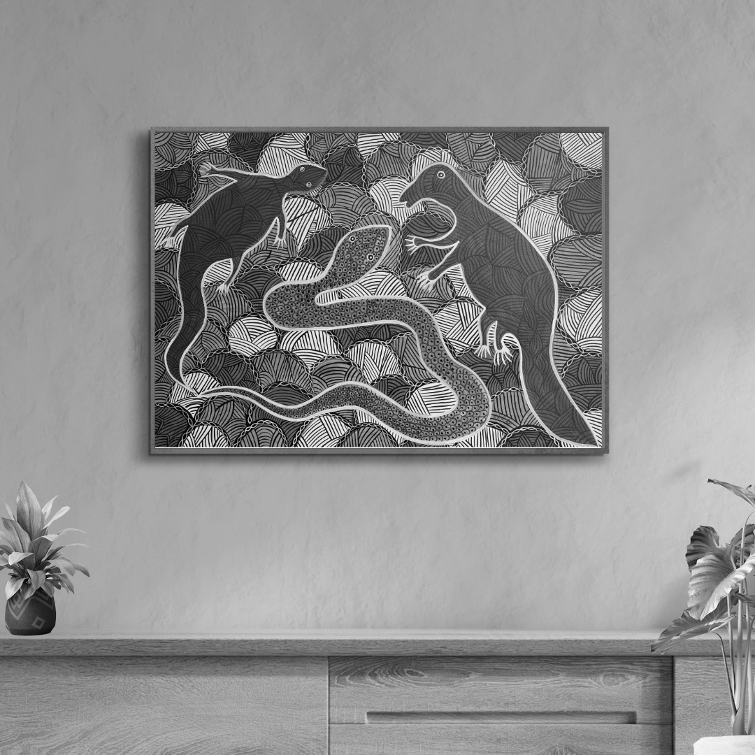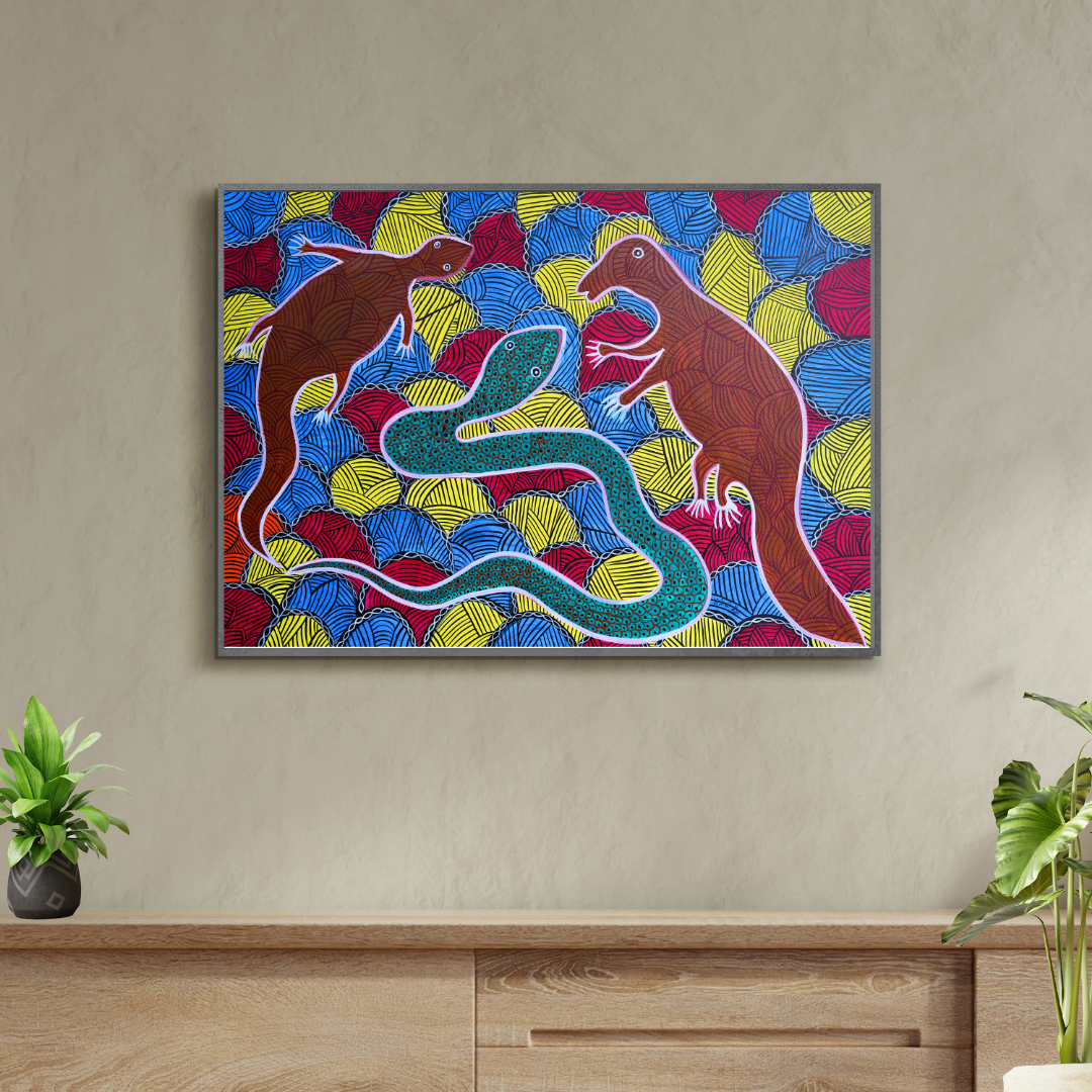 The expressions and body language of the Gohti Naag (cobra) and Newla (mongoose) vividly capture the psychological tension between these two animals. The cobra's wide, intense eyes suggest alertness and a sense of impending danger, while its flared neck—a defensive and aggressive posture—indicates both intimidation and readiness to strike. Its coiled body, poised for swift action, adds to the atmosphere of latent power and heightened vigilance. On the other hand, the mongoose's wide eyes convey awareness of the threat, yet its defiant and determined gaze reflects courage. Standing tall and erect, the mongoose's posture symbolizes confidence and a fearless willingness to confront the danger head-on. Together, these elements create a dynamic interplay of aggression and defiance, where both animals exhibit urgency, determination, and readiness for the inevitable clash. This tension is further enriched by the cultural significance of the cobra and mongoose in Indian folklore, where the cobra represents power and danger, and the mongoose embodies bravery and resilience.
