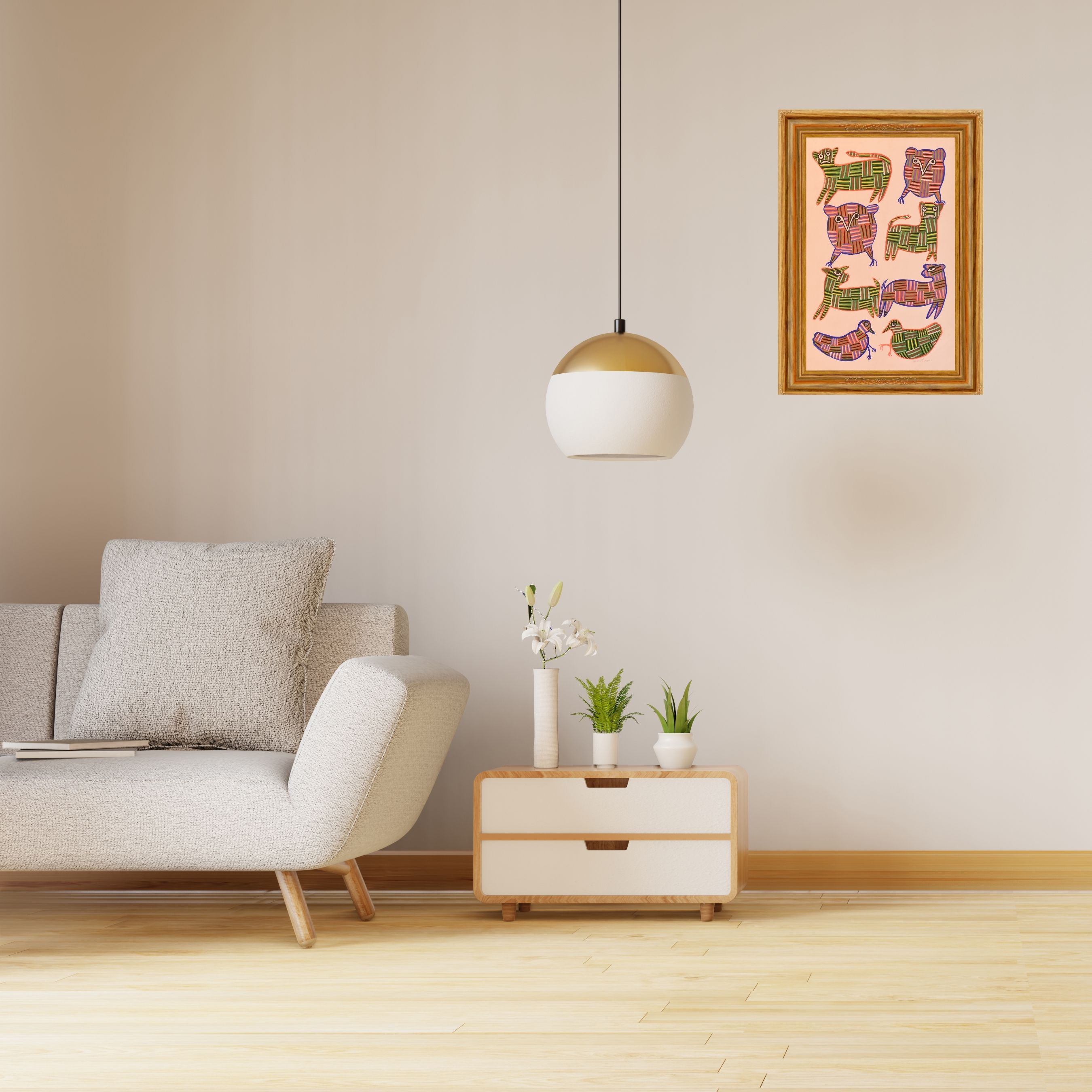 Eight creatures fill this handmade painting by Kala Bai Shyam in a grid-like arrangement of animal forms, each one rendered in bold, interlocking stripes of green, blue, red, pink and brown that give every body a woven, basket-like texture. The menagerie includes deer, owls, cats, dogs and birds, each creature occupying its own space on the warm peach ground, their wide eyes and expressive faces giving every figure a distinct personality. Two round, owl-like creatures sit at the centre with large, heart-shaped facial markings, their compact bodies contrasting with the elongated forms of the running deer and reclining cats that surround them. At the bottom, two birds face in opposite directions, their plump bodies patterned with the same striped, woven technique that unifies the entire composition. Painted in acrylic on paper, the work presents a Gond bestiary: a catalogue of forest inhabitants rendered with affection, humour and an unmistakable graphic boldness.