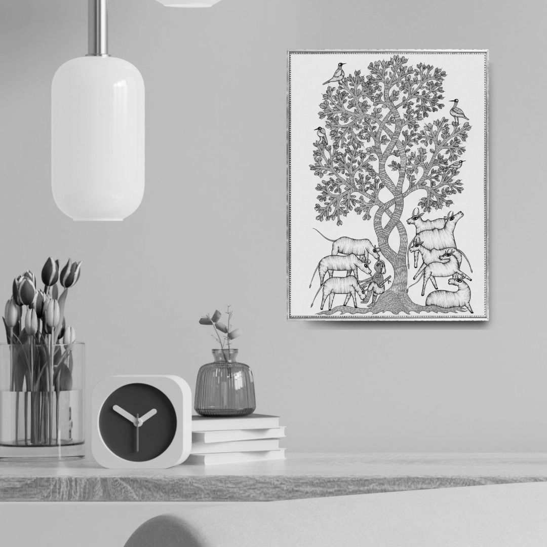 Suresh Dhurve works within the Gond tradition of Madhya Pradesh, where repetition is a method of understanding life as continuous and interconnected. In acrylic on paper, he constructs each animal from within, layering line upon line until presence accumulates. Gond Animals VII transforms familiar creatures into emblems of rhythm, balance and quiet strength, rendered through a visual language that is at once ancestral and distinctly contemporary.