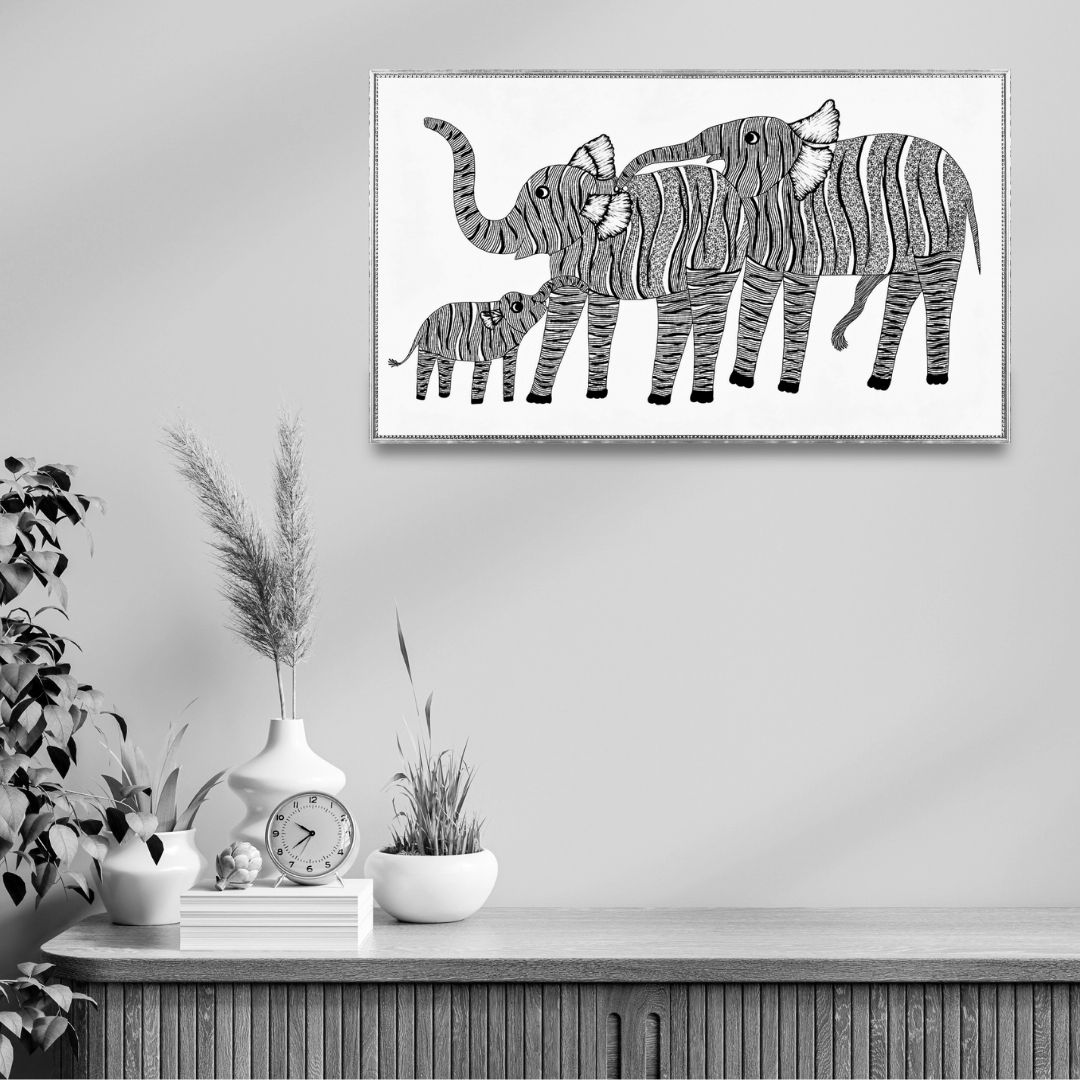 The monochrome surface intensifies this structural clarity. Without the distraction of colour, the eye follows the shifts in density and direction, reading the animals as built forms rather than outlined shapes. Negative space remains deliberate and unbroken, giving the figures room to assert their presence while maintaining the overall compositional harmony. The repetition of line becomes both texture and pulse, suggesting life through rhythm rather than gesture.