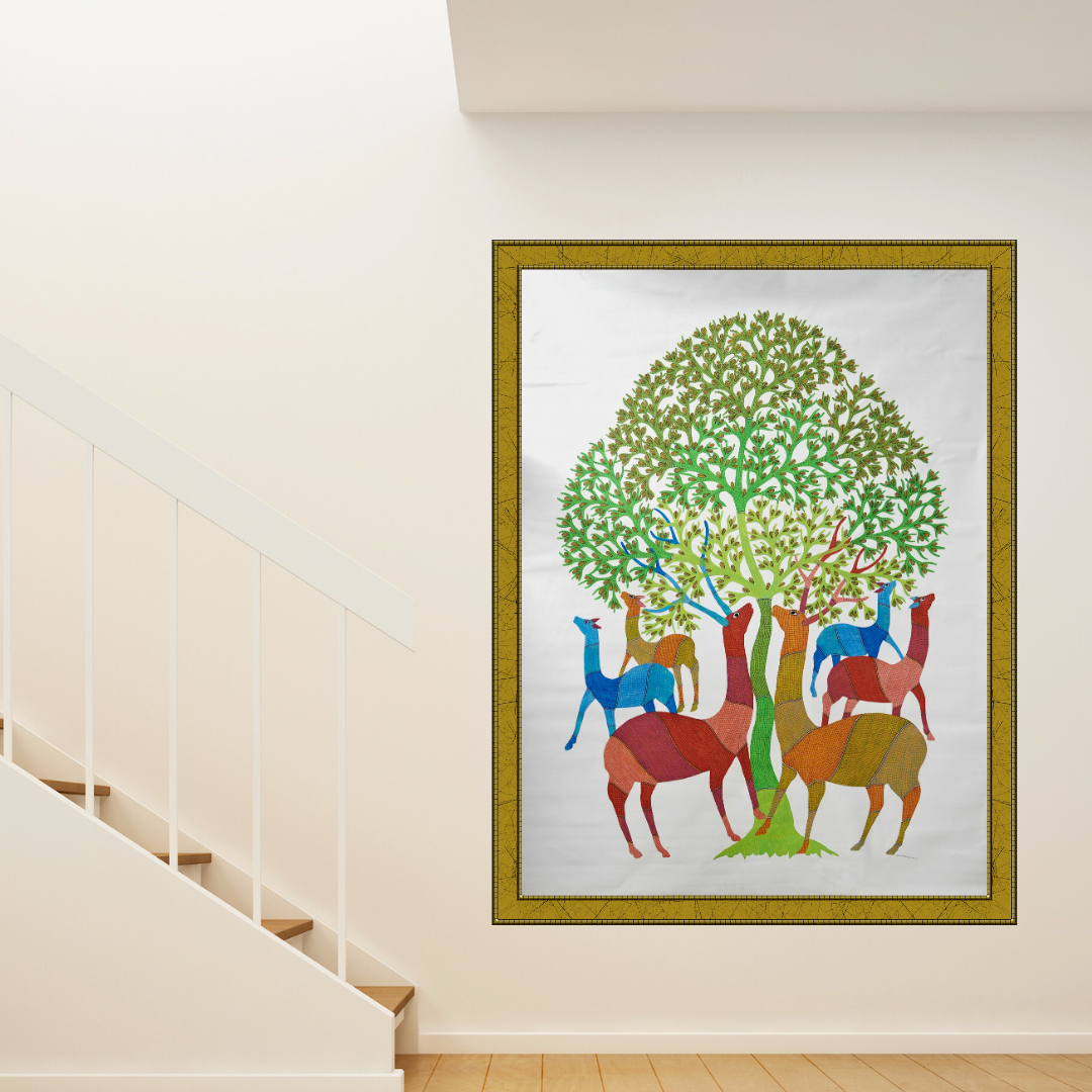 A Symbol of Peace and Presence – The deer, often seen as forest guardians in Gond tradition, stand grounded yet graceful, embodying alertness, unity, and protection.