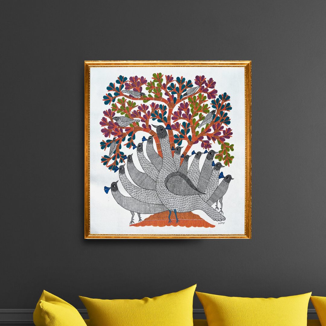 In this breathtaking piece of Gond art by Brajbhushan Dhurve, the vibrant pulse of nature leaps off the canvas through a stunning portrayal of a group of peacocks. The scene is set beneath a richly colored, lush tree, its branches stretching wide across the canvas, with some birds perched gracefully among the foliage and others gathered below. Master artist Dhurve’s signature style brings each element to life with intricate patterns and an energetic flow that reflects the spirit of the forest. In this painting ideal for homes or offices, the peacocks, adorned in soft greys and blacks, are brought alive with fine detailing and rhythmic designs, while the tree behind them is rendered in warm shades of brown, green, pink, and blue. Delicate line work covers the canvas, adding a textured harmony that ties the composition together. This painting not only captures the elegance and beauty of the peacock but also evokes a deep sense of movement, celebration, and connection to nature, making it a perfect piece to infuse any space with warmth, colour, and vitality.