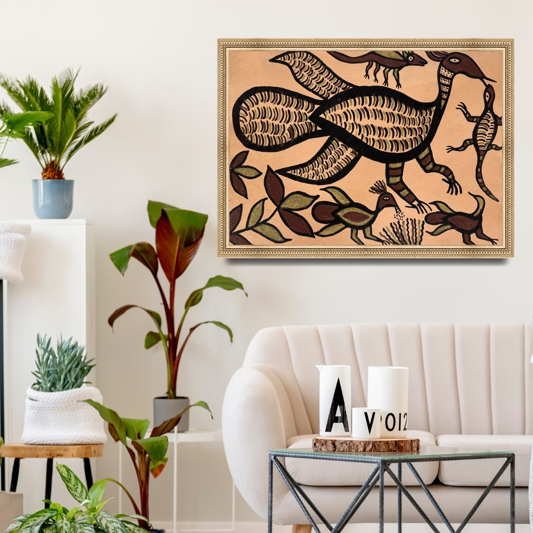 The artist’s confident brushwork, shaped by generations of mural traditions, translates nature’s rhythm into visual poetry. With its earthy tones and dynamic lines, this painting celebrates the sacred relationship between animals, plants, and the land; a relationship both timeless and alive in the tribal imagination.