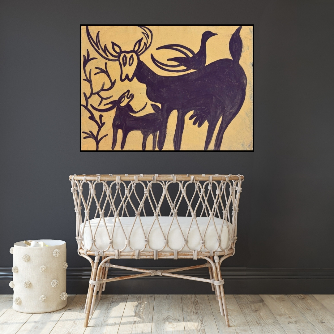 Horns and Wings' by Philomina Tirkey paints a tender scene of kinship between an antlered animal, its young, and a bird resting nearby. The forms are bold yet kind, outlined in deep black against a warm ochre ground. There is something universal about this gathering of creatures; a shared instinct to protect, nurture, and coexist. The simplicity of execution makes the emotional tone even stronger.