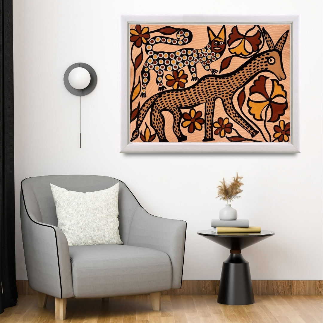 Hunt Beneath the Blossoms is a vivid reflection of the wild balance between life, instinct, and beauty. Through bold lines and vibrant forms, Karu Ganju brings to life a dynamic scene where a wild cat and a deer share the same floral space. The flowers bloom around them, softening the primal energy with nature’s quiet grace.