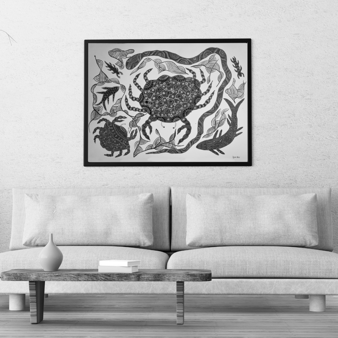 The artwork depicts water as a vital, sacred element by illustrating it as a source of life, nourishment, and spiritual purity. Water is often shown flowing through the composition, symbolizing continuity and renewal. Its central role highlights the Baiga people's dependence on water for survival, agriculture, and rituals, reinforcing its sacredness in sustaining both physical and spiritual well-being.