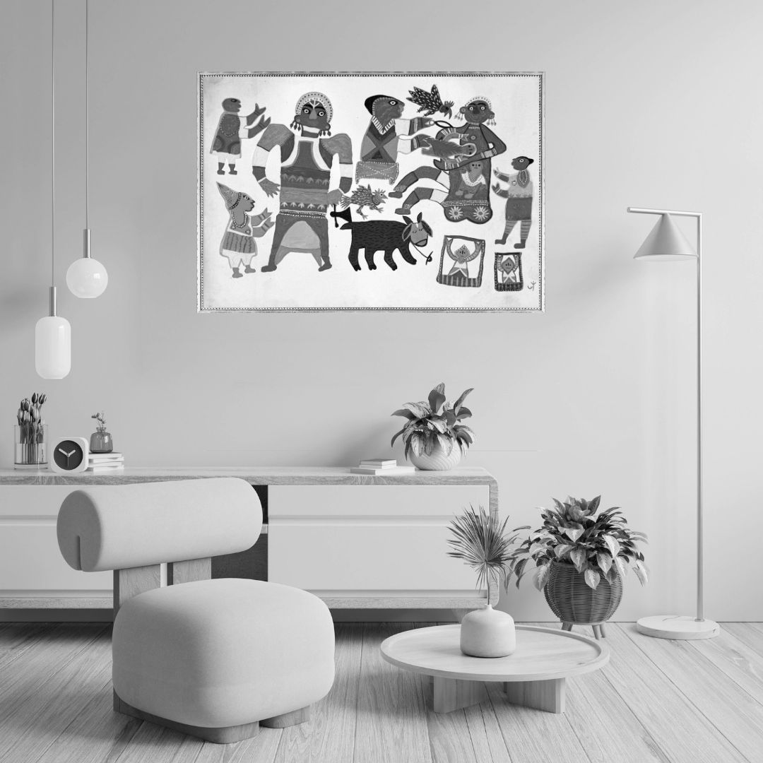 The composition's open, frieze-like arrangement across the white ground gives the ritual scene a timeless, almost mural-like quality, each figure and creature occupying its own clear space within the collective action. The inclusion of animals, birds and children alongside the central healing figure reflects the Baiga worldview in which ceremony is not separate from daily life but continuous with it. The two framed figures at the lower right introduce a second visual layer within the composition, suggesting the presence of vision, spirit or memory operating alongside the physical scene. Jodhaiya Bai's status as a Padma Shri laureate and keeper of Baiga visual tradition gives this painting the weight of cultural testimony as much as artistic achievement.
