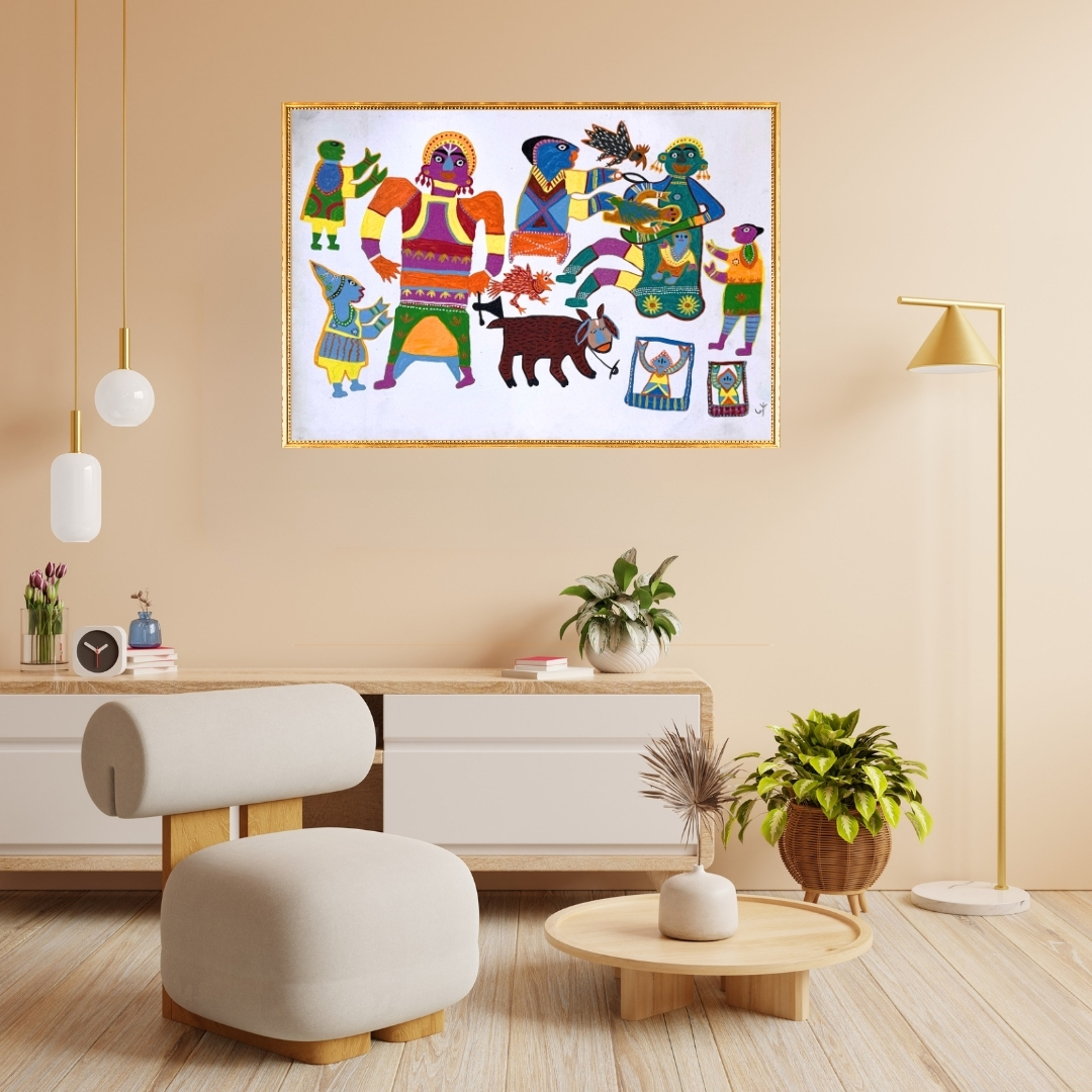 Jhaad phoonk bali refers to the ritual practices of healing, spirit appeasement and sacrifice that form a central part of Baiga spiritual life. Jodhaiya Bai paints this ceremony not as spectacle but as lived experience, the ordinary and the sacred folded into one another without hierarchy or explanation. Each figure is rendered in the bold, flat colour and confident outline that characterises her hand: green skin, blue skin, the wide eyes of people entirely absorbed in what they are doing. Painted in acrylic on canvas, the work carries the visual logic of a community whose relationship with the unseen world is practical, immediate and matter-of-fact. Jodhaiya Bai, a Padma Shri recipient and one of the foremost Baiga artists of her generation, documents this world from the inside, with the authority of someone for whom these ceremonies are not subject matter but lived memory.