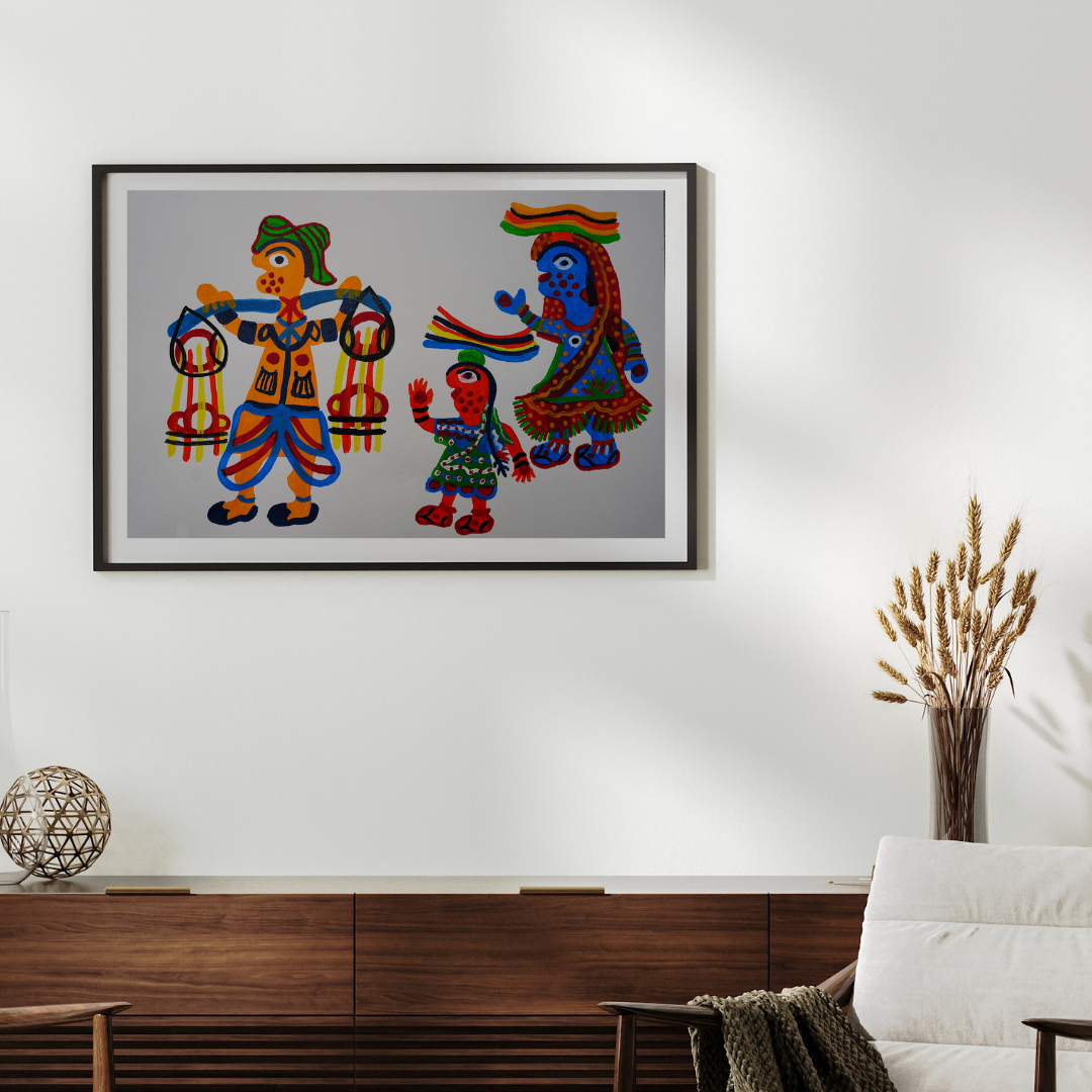 The artwork conveys themes of survival, family, and the connection to nature. It highlights struggle and resilience of tribal family as they gather wood from the forest, reflecting the balance between human needs and the environment.