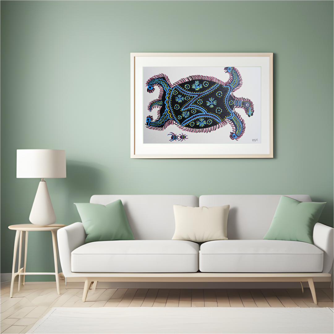 The use of vibrant colors in "Kacchua" creates a lively and energetic mood, enhancing the sense of vitality and movement. The bright hues evoke a feeling of optimism and celebration, making the artwork feel dynamic and full of life, while drawing attention to the central figure of the turtle in a bold and engaging way.
