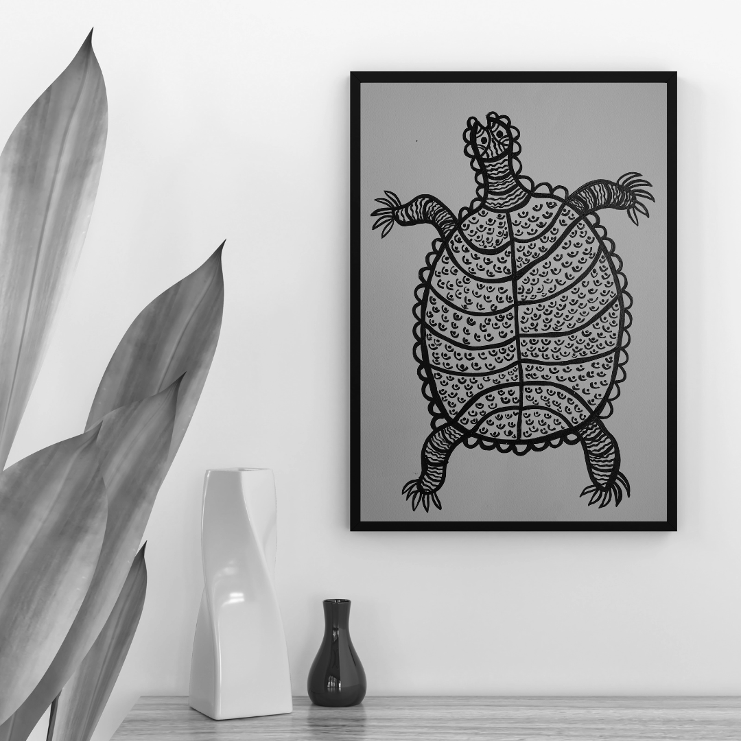 The painting turtle posture likely symbolizes stability, endurance, and protection. Its low, grounded position reflects a connection to the earth, while its orientation may emphasize the turtle slow, deliberate movements, representing patience and the passage of time.