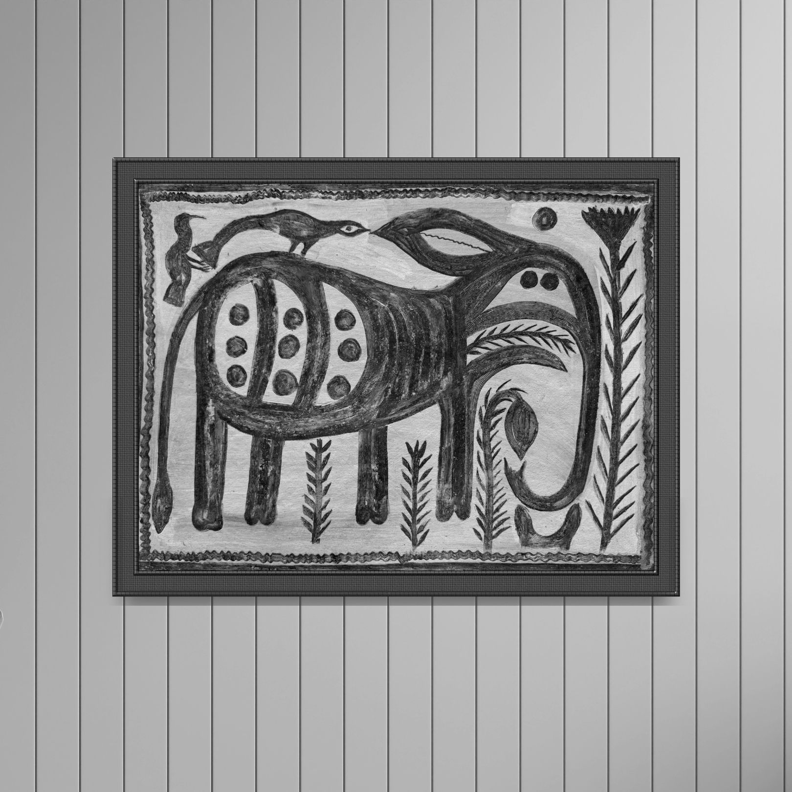 Keeper of the Harvest by Malo Devi is a 2018 work where Malo Devi reimagines the elephant—a recurring Khovar symbol of endurance and prosperity—with striking simplicity. The “One Ear Elephant” becomes an emblem of wisdom in imperfection, adorned with circular motifs that reference seeds and harvest cycles. The minimal palette of charcoal grey and white heightens its primal energy.