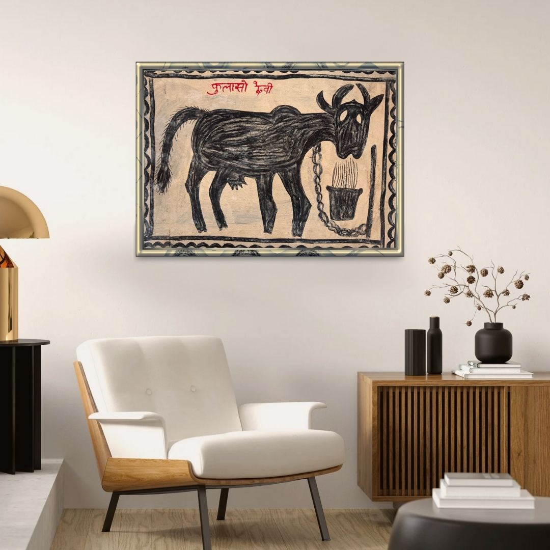 Each brushstroke reflects the artist’s deep-rooted reverence for nature’s giving forces. The intricate border frames the composition like a woven memory, grounding the cow as both a nurturing spirit and a protector of the household. Rooted in ritual yet universal in its tenderness, this artwork speaks softly of endurance, compassion, and the rhythm of rural existence.
