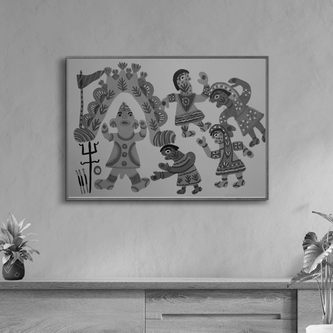 In one her original Baiga artworks available on Rooftop, “The Village Fair Around the Temple,” Sakun Bai captures the pulse of faith and festivity through rhythmic patterns, communal gatherings, and warm, celebratory energy. It is paintings like these which celebrate the spirit of community that make her artwork a great fit for many spaces which need to reflect that vibe.