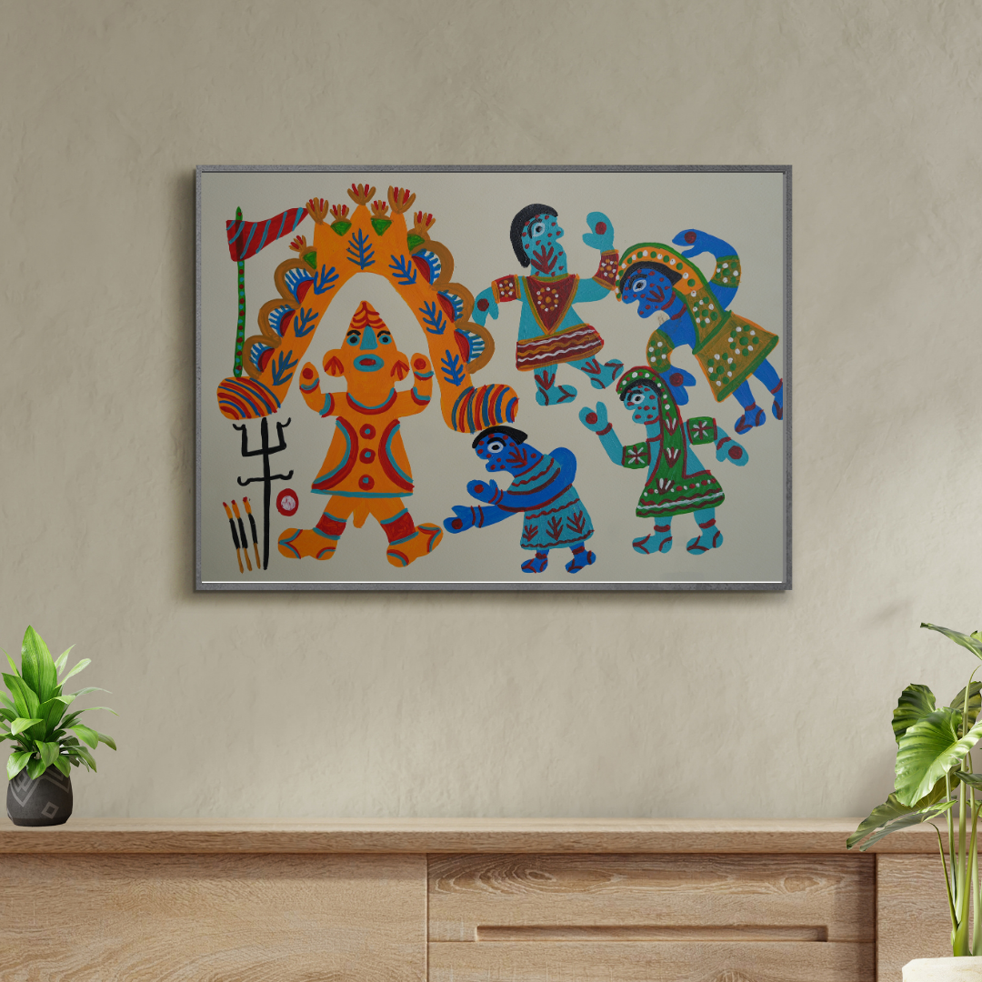 In her paintings, Sakun Bai captures the spirit of a village religious celebration. She portrays villagers gathered around the temple, performing rituals, and enjoying the lively fair. The paintings highlight the deep bond between faith and festivity, showing the collective energy and cultural essence of the community.