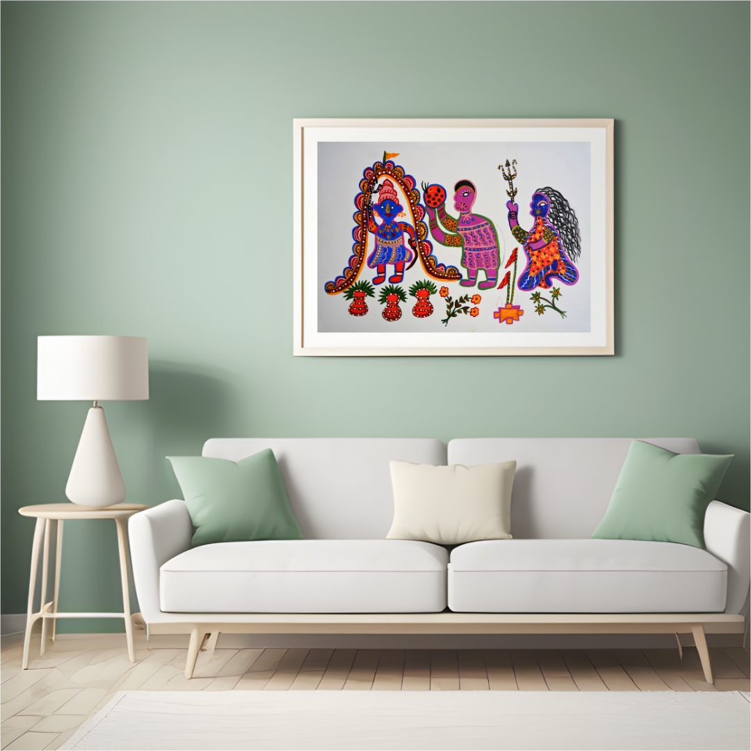 The artwork highlights the sacredn of the ritual by emphasizing symbolic elements like offerings, ritual objects, and the divine presence of the goddess Kher Dai. The use of vibrant colors, focused compositions, and sacred motifs the importance of the pooja in connecting with the spiritual realm, while depicting the reverence and devotion involved in invoking the goddess's protection and blessings for the community.