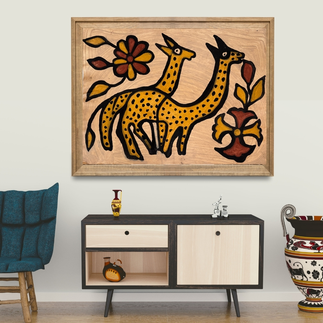 The artist’s use of organic tones and fluid brushwork brings the composition to life, blending the innocence of wildlife with the elegance of Sohrai tradition. Each line and pattern resonates with the deep understanding of nature’s design, transforming simplicity into soulful expression.