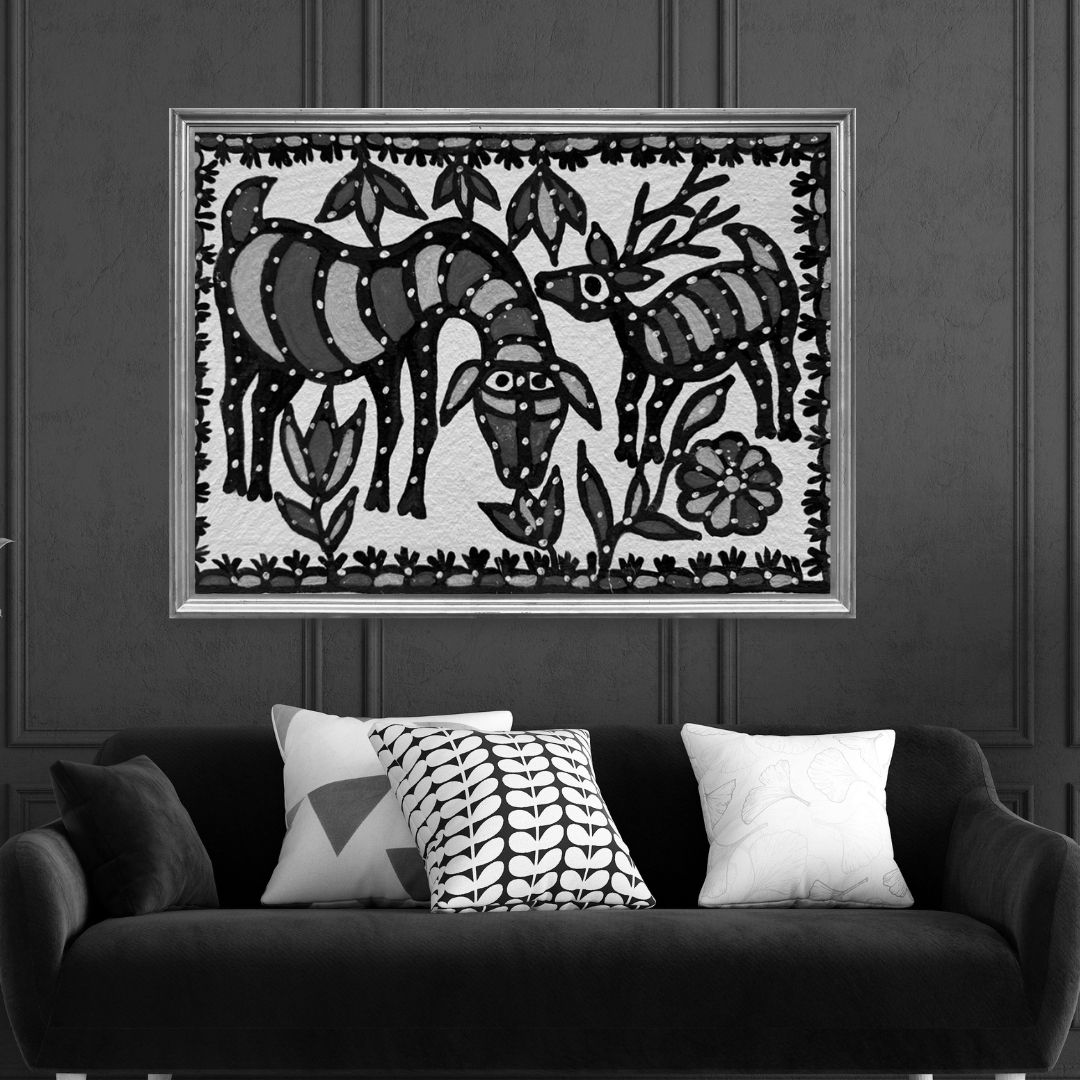 Each brushstroke reflects the pulse of the earth and the sacred bond shared between living beings. The stylised patterns, framed with decorative borders, bring forward the tribal wisdom of harmony, fertility, and kinship within nature.