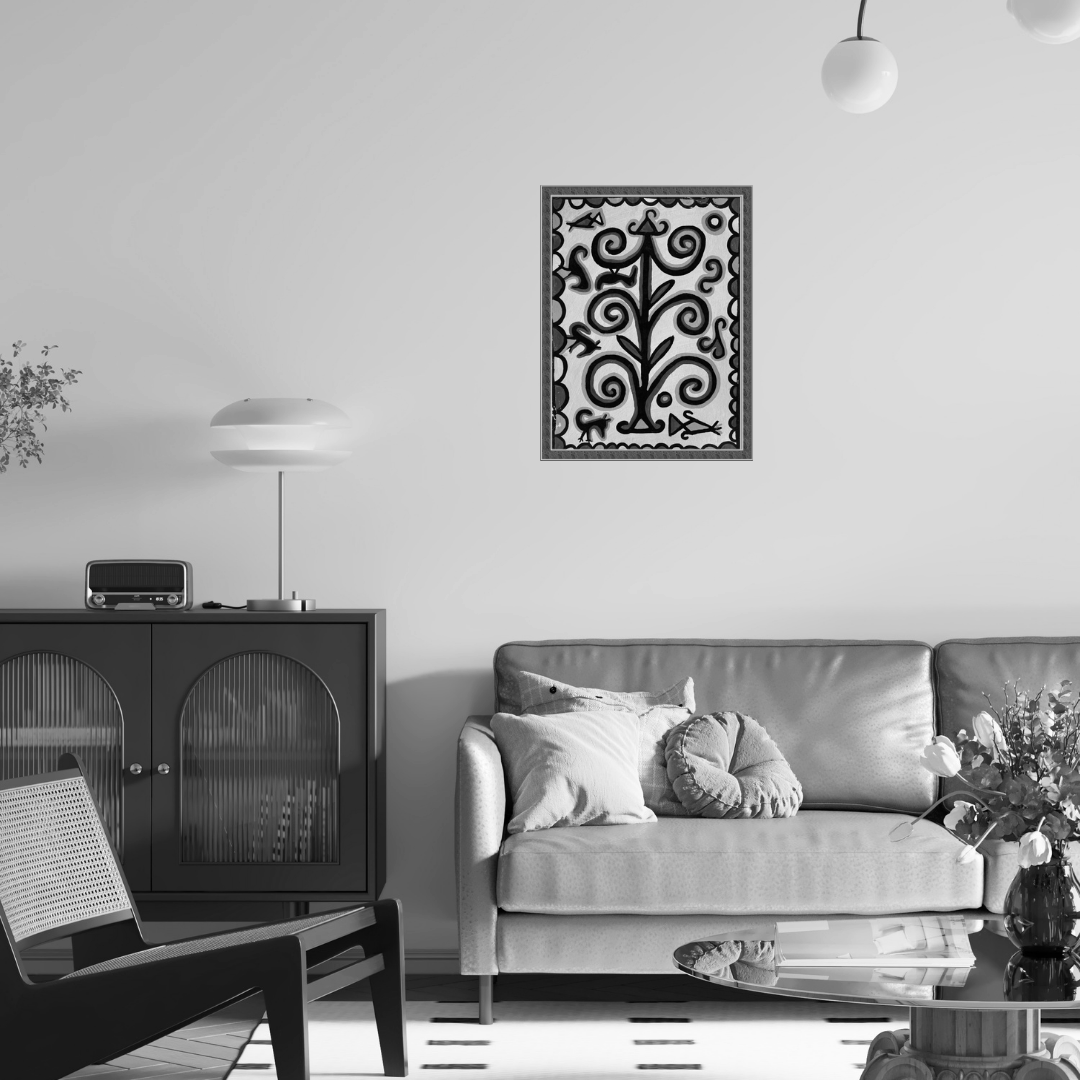 Living Roots' by Parwati Devi is a quiet celebration of growth, balance, and connection. The painting rises from the earth, each spiral branch unfurling with a sense of movement and renewal. Using simple, natural colours, Parwati Devi transforms clay pigments into symbols of life’s continuity, echoing the ancient belief that all beings are part of one living rhythm. Around the tree, animal and bird forms appear like guardians of nature, each line alive with warmth and instinct.