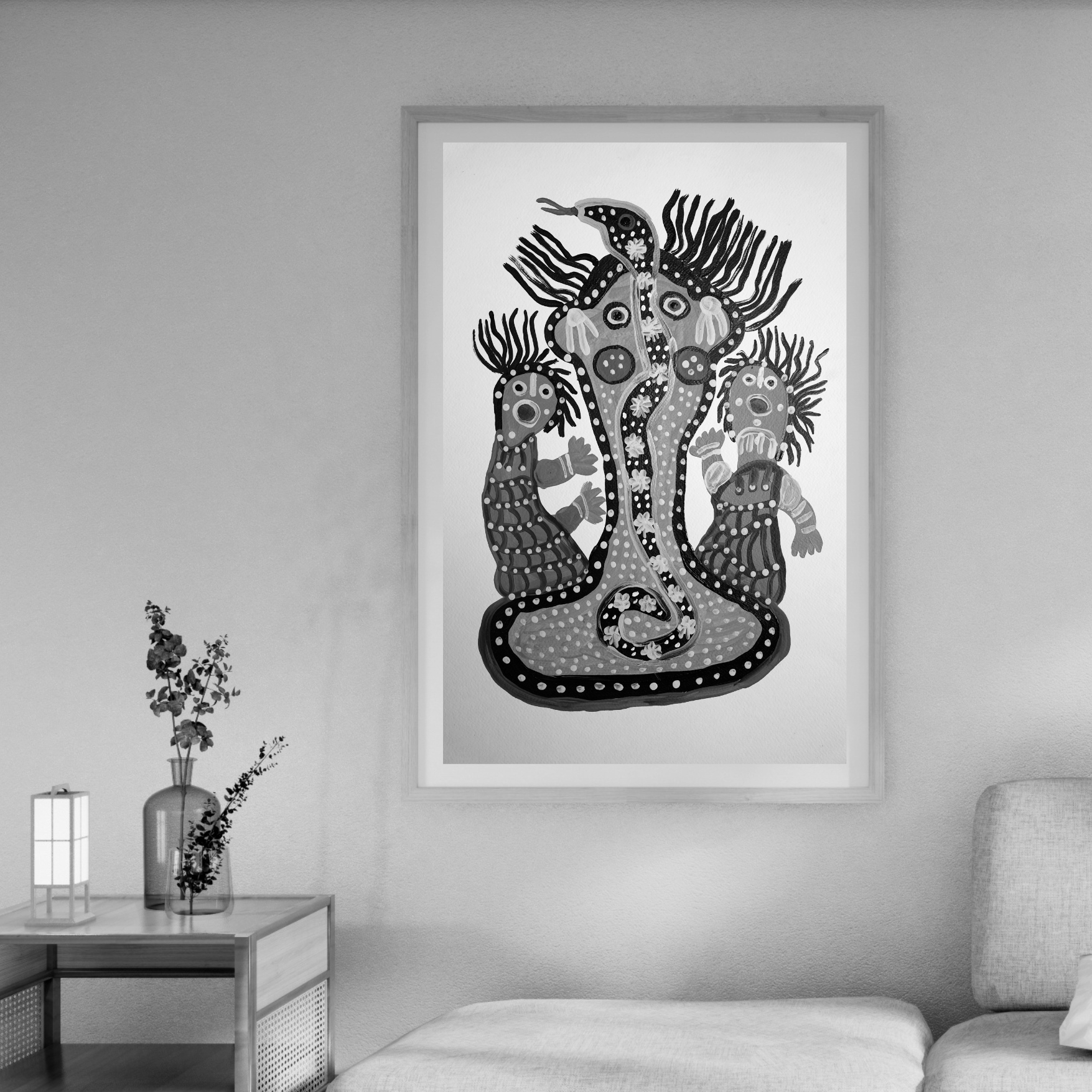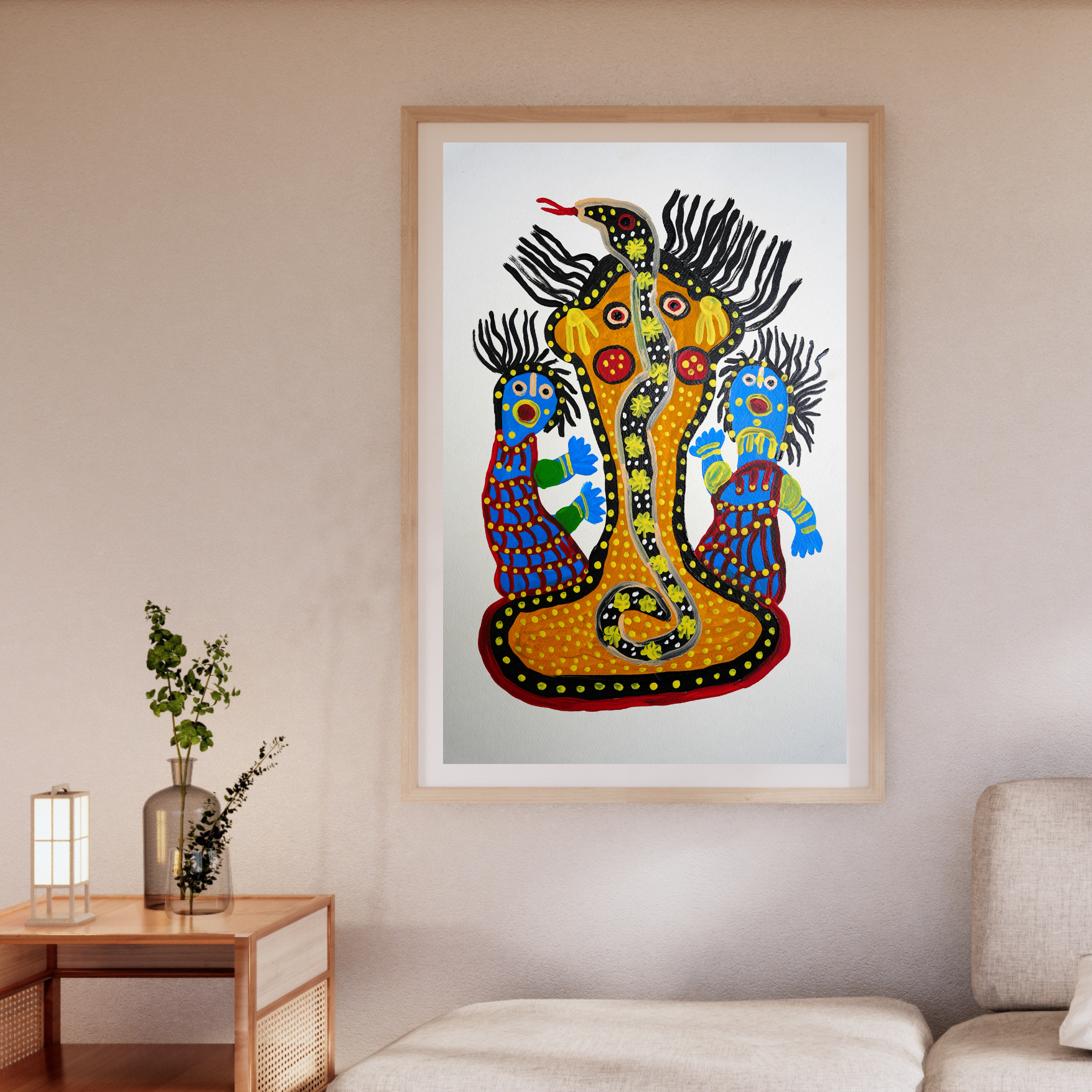 The artwork depicts Lord Ganesha in a vibrant and stylized manner, with bold colors and simplified forms. It deviates from the traditional iconography by representing Ganesha as a central figure with two female figures flanking him. The artwork incorporates elements of modern art with its abstract shapes and bold lines, suggesting a fusion of traditional and contemporary aesthetics. This evolution reflects the changing artistic expressions within religious practices, allowing for diverse interpretations and representations of deities.