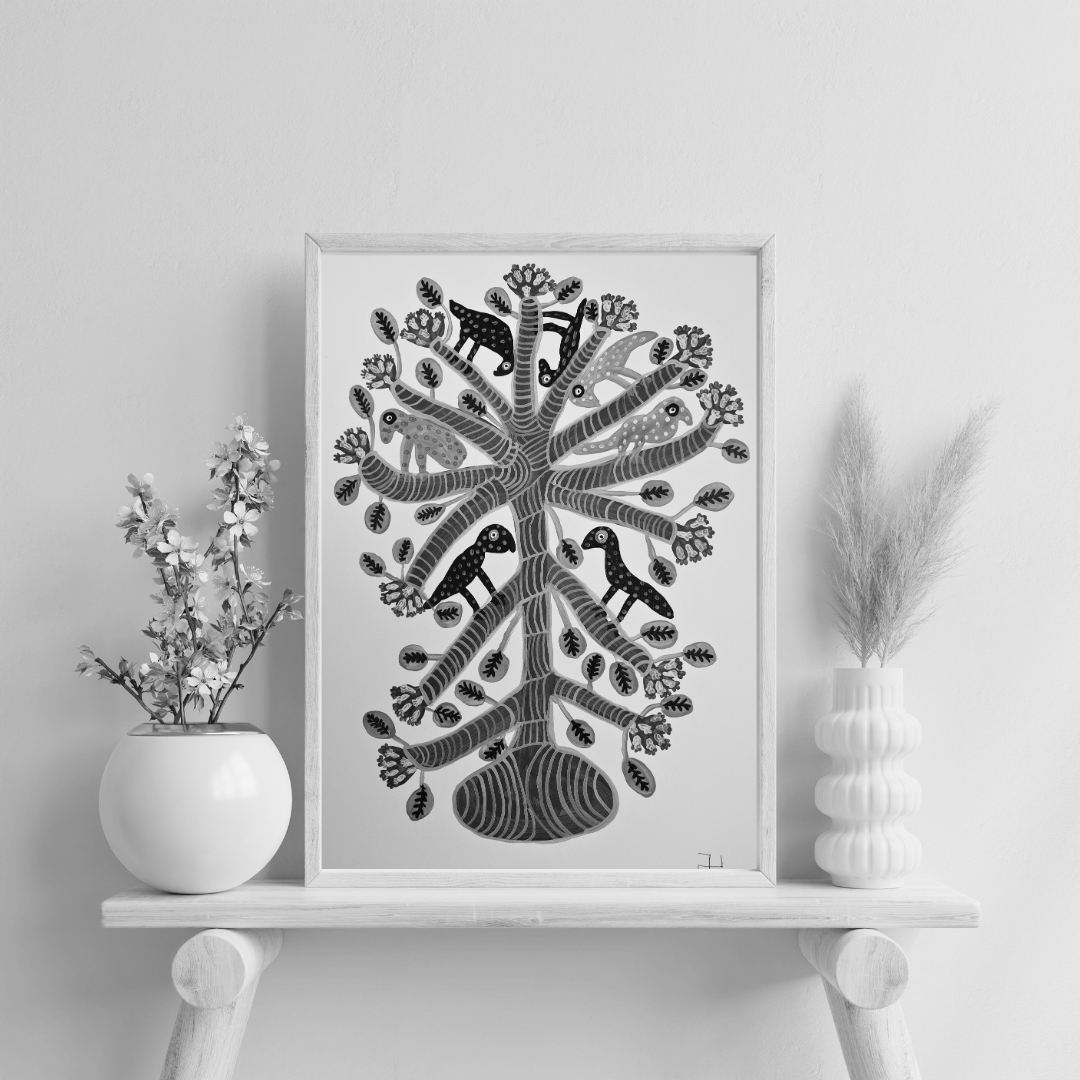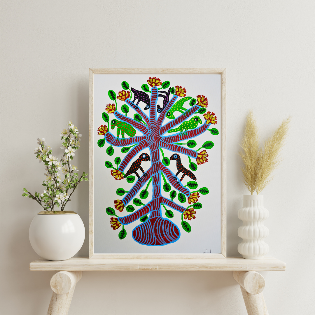 The artwork reflects the Baiga tribe’s worldview through the central symbol of the Tree of Life, which connects the underworld, earth, and heavens, symbolizing the interconnectedness of all beings. The animals and birds depicted on the tree highlight the Baiga belief that every living creature plays a role in the cosmic order. The vibrant colors and intricate patterns emphasize the energy and vitality of nature, which the Baiga deeply respect. In contemporary settings, this artwork could be adapted as public murals, fashion designs, or digital art to bring attention to Baiga culture while maintaining authenticity. It could also serve as an educational tool to teach about the Baiga’s connection to nature, as long as adaptations respect their traditions and involve Baiga artists to preserve the artwork’s true meaning.