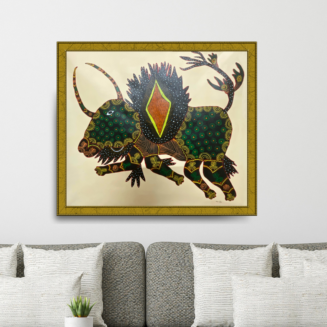 The painting "Majestic Ox" by Roopa Bai, done in the traditional Baiga art style, shows the strength and beauty of an ox against a white background. The artist uses detailed flower patterns and intricate designs to bring the animal to life, making the painting very beautiful. Bright colors like green, black, yellow, and orange add to its beauty and draw attention to the ox's strong presence. In Baiga culture, animals are very important and represent strength, survival, and a close relationship with nature. The ox, known for its hard work and toughness, is shown with respect. Its strong stance reflects how the Baiga people honor the wild and the natural world that supports life. This artwork shows the special connection between humans and animals, celebrating how they live together. The detailed patterns and bright colors make this painting a wonderful tribute to the majestic ox.