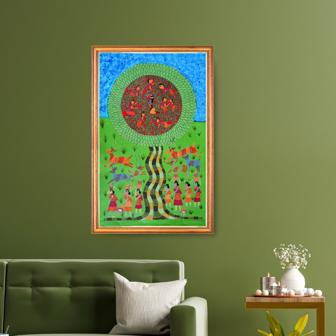 In this vibrant Gond art piece by Suresh Dhurve, the playful and enchanting scene of Mischievous Krishna unfolds near the riverbank. At the heart of the painting, Lord Krishna is on the top of the tree surrounded by his friends, mischievously throwing stones at the Gopis who carry pots of buttermilk. The lively tree, painted in rich, vivid colors, adds energy to the scene while animals surround the base, creating a harmonious connection between nature and the divine. With intricate details and meticulous patterns, Dhurve brings this moment to life, capturing the joyous spirit of the legend with an infusion of color, life, and movement. This beautiful painting radiates the playful essence of Krishna’s mischievous nature and the vibrant world he inhabits.