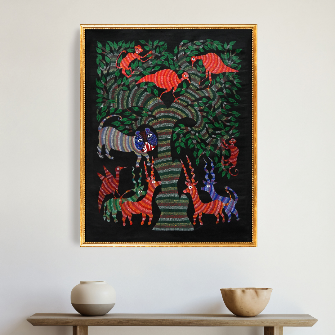 Rich in earthy tones and bold contrasts, the painting captures the raw charm of tribal life and wildlife, making it a captivating visual experience. The simple yet layered composition adds rustic elegance to any space, making it ideal for home décor, studio walls, or as a thoughtful gift for art enthusiasts. Measuring 39.6 x 37 inches, this handcrafted artwork is an ideal display piece.