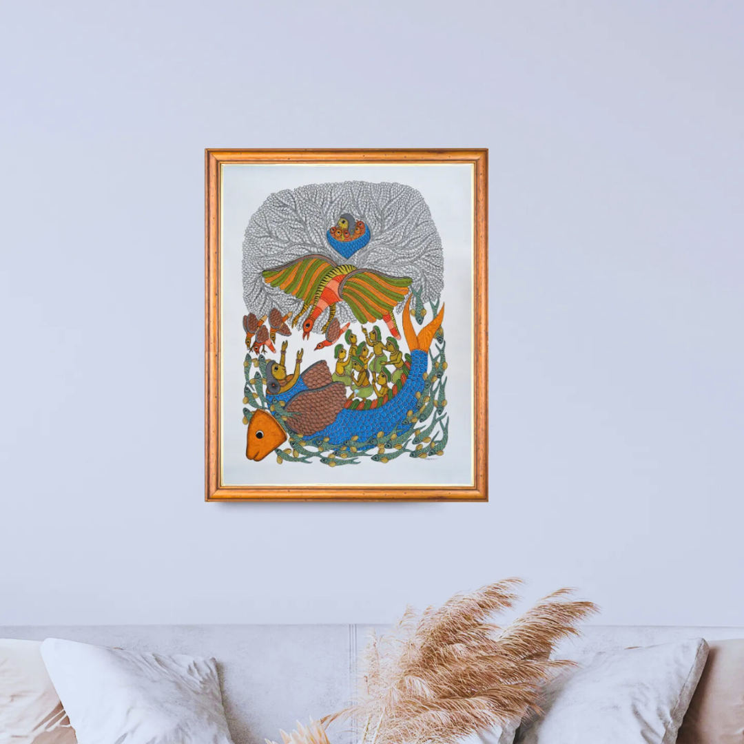 Myth Meets Nature – The fish, birds, trees, and figures together represent harmony between divine intervention and earthly life.
