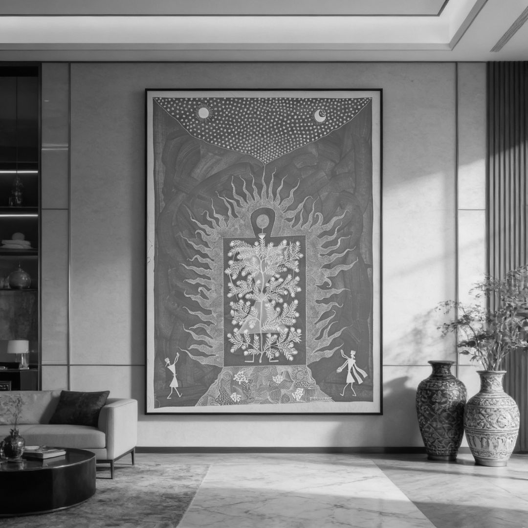 The framed sacred tree at the centre creates a visual altar, holding the entire composition in a state of quiet consecration. Radiating flame forms built entirely from dotwork give the painting a charged, ceremonial energy without losing intimacy of scale. The dual presence of sun and moon within the celestial arc speaks to the Warli worldview of nature as a unified, breathing whole. Anil Vangad's mastery of the tradition carries the authority of lived practice, making this a document as much as a painting.