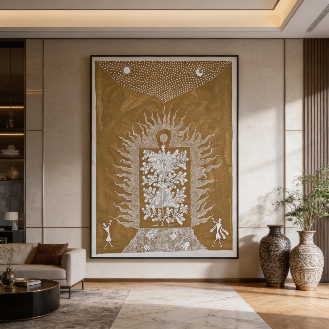 A sacred tree stands held inside a luminous frame, its branches spreading in all directions like breath released into open air. Around it, flames arc outward in long, rhythmic curves, filling the ochre field with a pulse of cosmic energy. Above, a starlit sky curves downward between the sun and the crescent moon, as though the heavens themselves have leaned in to witness what burns below. At the base, two Warli figures move lightly at the edges of the scene, small, unhurried, present, their quiet presence a reminder that this vision belongs to the living world as much as the divine.