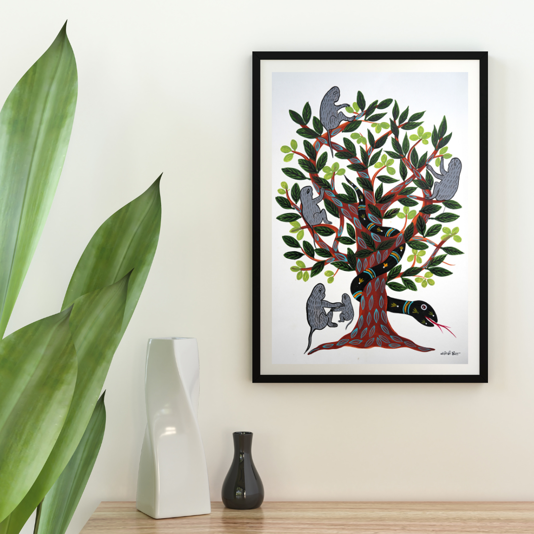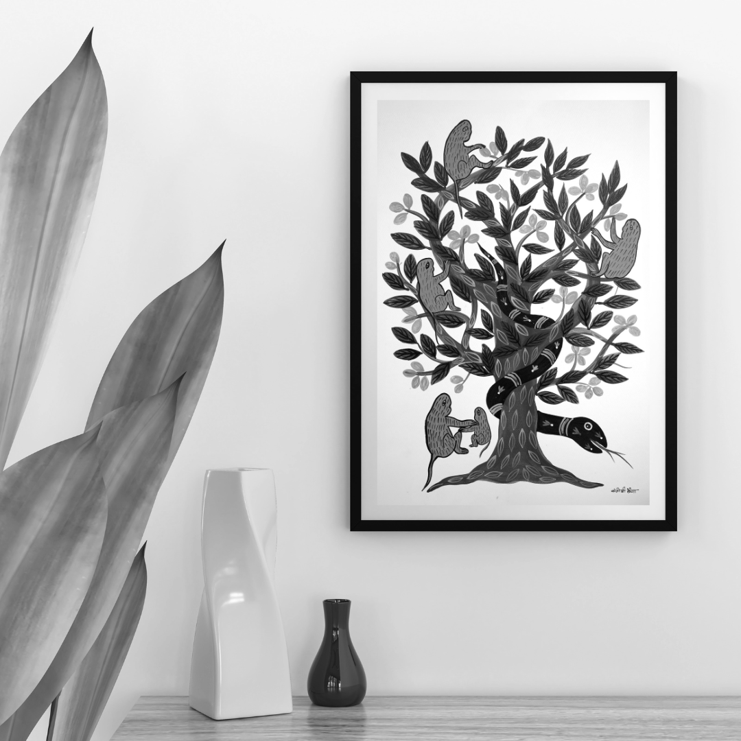The artwork titled Neem ka Ped Saanp or Bander offers an insightful glimpse into the Baiga community's understanding of the cycle of life. The neem tree, known for its medicinal properties, symbolizes life, growth, and healing, representing the continuous flow of life and its nurturing essence. The monkeys on the tree, often associated with playfulness and mischief, reflect the unpredictable and joyous aspects of existence, reminding us that life is filled with moments of spontaneity and surprises. Meanwhile, the snake, a powerful symbol in many cultures, embodies transformation and renewal, representing the inevitable changes and transitions that occur throughout life. Together, these elements weave a narrative of life as a cycle of growth, change, and renewal, highlighting its balance of positive and challenging experiences. This interpretation suggests that the Baiga view life as an interconnected journey of creation, transformation, and regeneration.