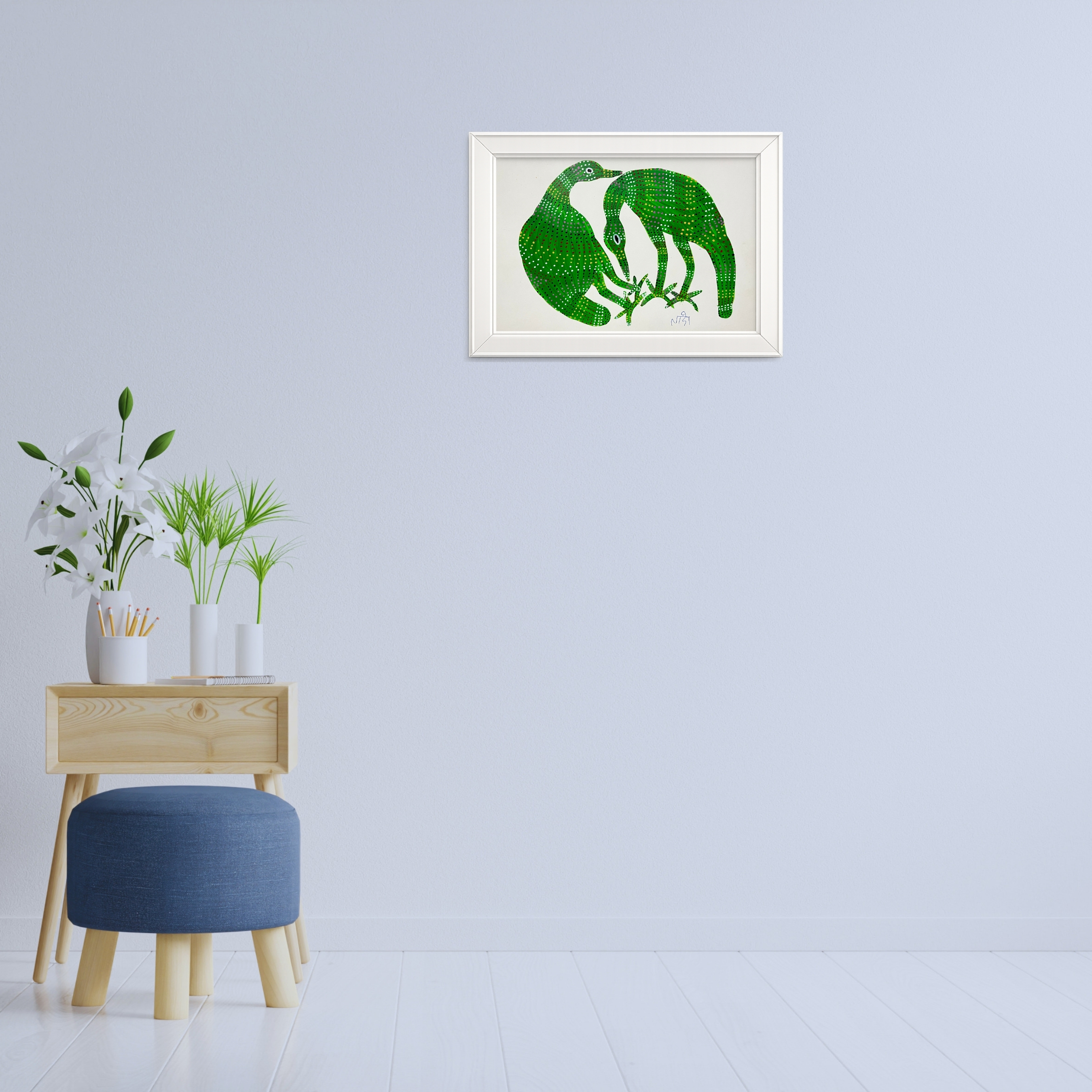 Two large green birds face each other in a gentle, curving embrace at the centre of this handmade painting by Lado Bai, their rounded bodies filling the composition with a lush, verdant presence. The larger bird on the left has a full, swelling form, its surface covered in dots of white, pink, red, yellow and black that create a subtle, shimmering texture across the vivid green. The second bird curves its long neck downward, its body more elongated and slender, its feet splayed at the base where the two forms nearly meet. The posture of the pair suggests tenderness, a moment of mutual attention between two creatures who share the same colour, the same language of pattern and the same quiet, unhurried world. Painted in acrylic on paper, the composition distils the subject to its emotional essence: two birds, one colour, one gesture of closeness.