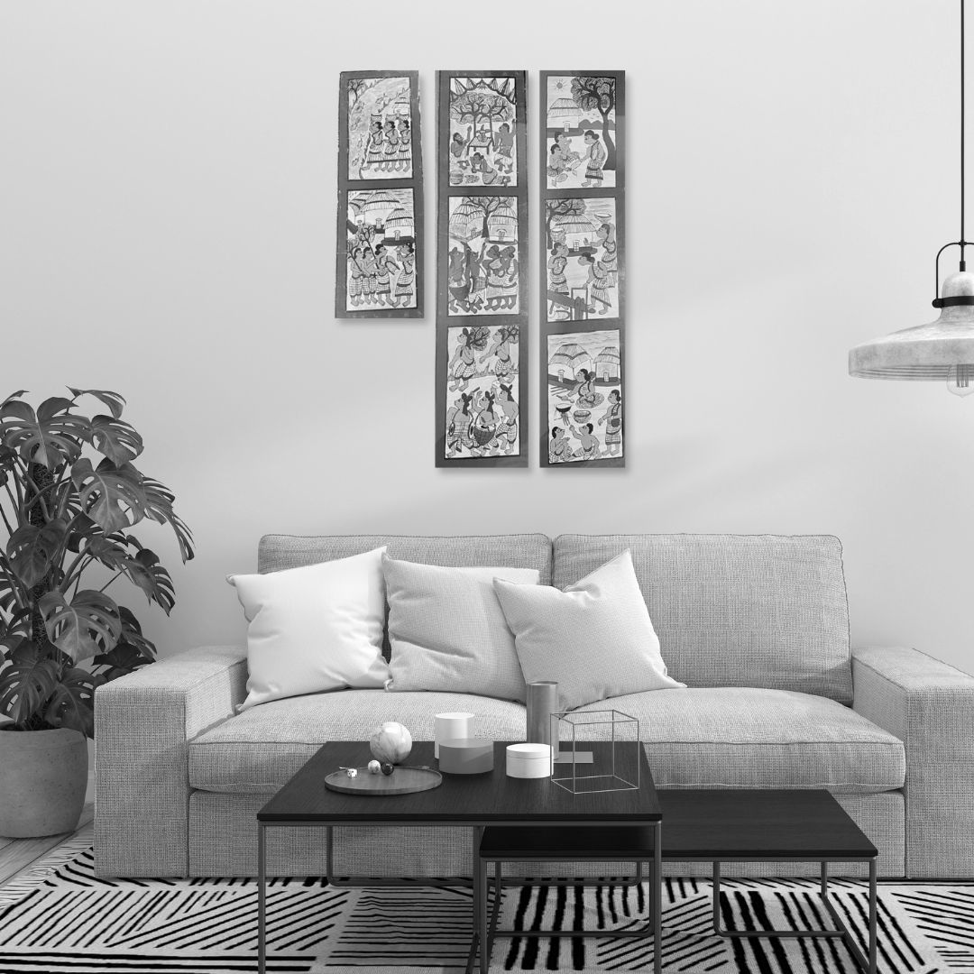 The composition presents a dynamic sequence of figures and elements that reflect the storytelling traditions of Paitkar folk art. Scenes of village life unfold through gestures of movement, work and interaction, with men and women appearing across the surface in rhythmic procession. Bold contours define the figures while compact linear patterns fill their forms, creating a lively visual narrative that captures the spirit of community life.
