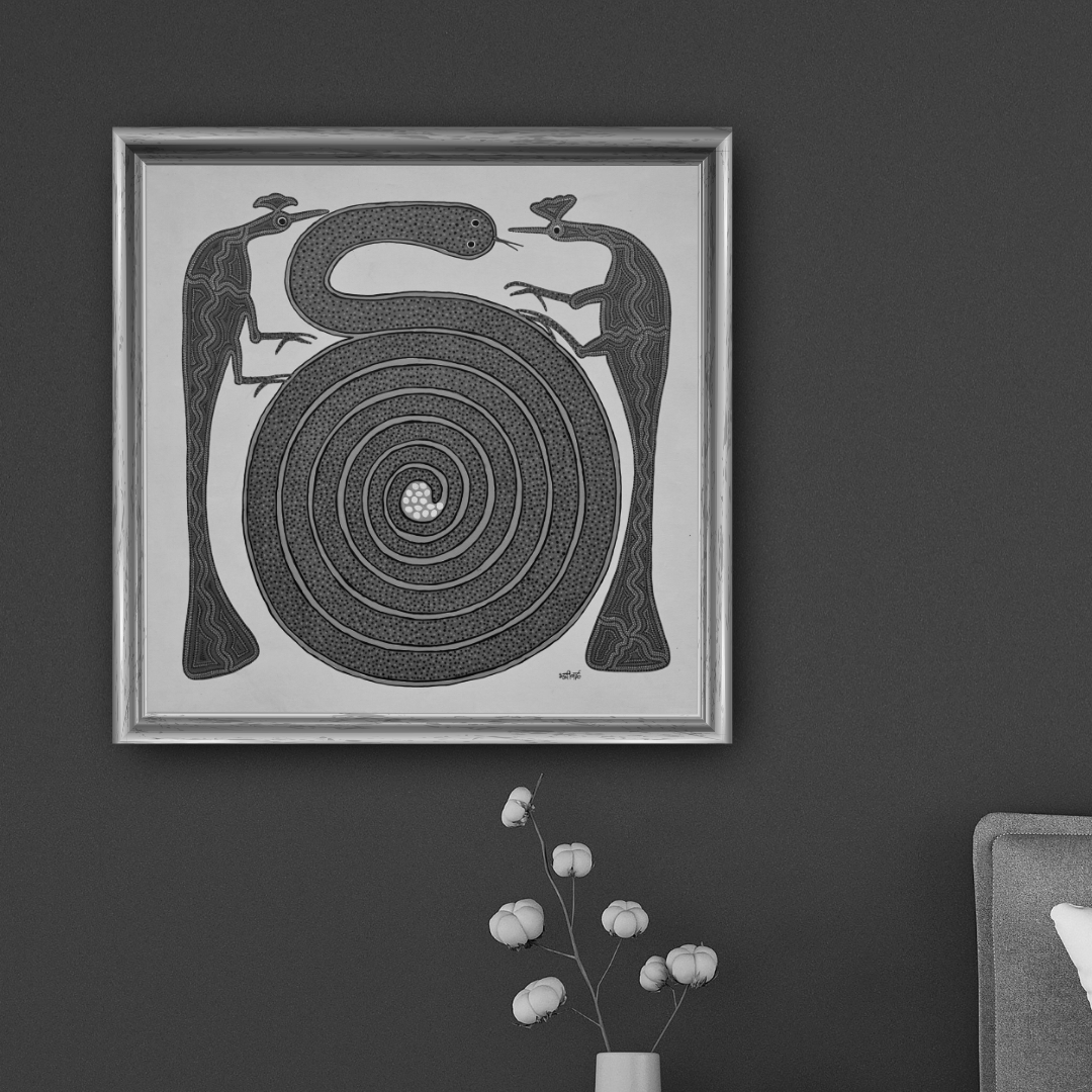 Bring home ‘Peacock & Snake with Eggs – A Battle of Survival’, a stunning portrayal of life in the wild, told through the vibrant lens of Bhil tribal art. A painting that teaches you many lessons and inspires many emotions. The artwork is 37x37 inches, a balanced square format that allows every intricate detail to be appreciated and fits into most spaces seamlessly.