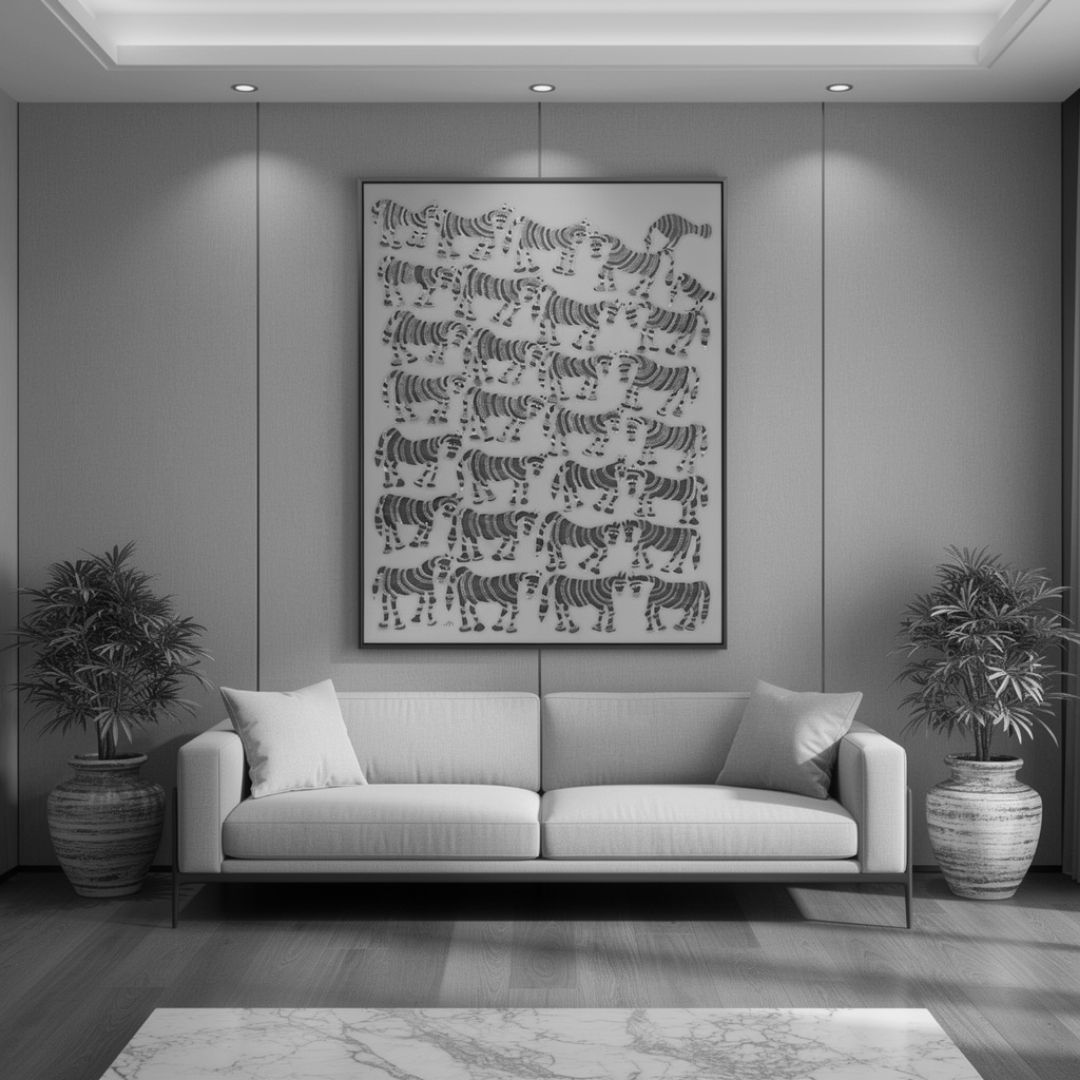 The all-over composition creates a sense of abundance and ceremonial abundance rooted in Bhil cosmology. Each horse is individually patterned, giving the collective energy of the herd an intimate, handcrafted character. The turquoise and crimson palette carries a visual intensity that feels both ancient and strikingly contemporary. Lado Bai's work belongs to a living oral-visual tradition, making this painting a cultural document as much as a work of art.