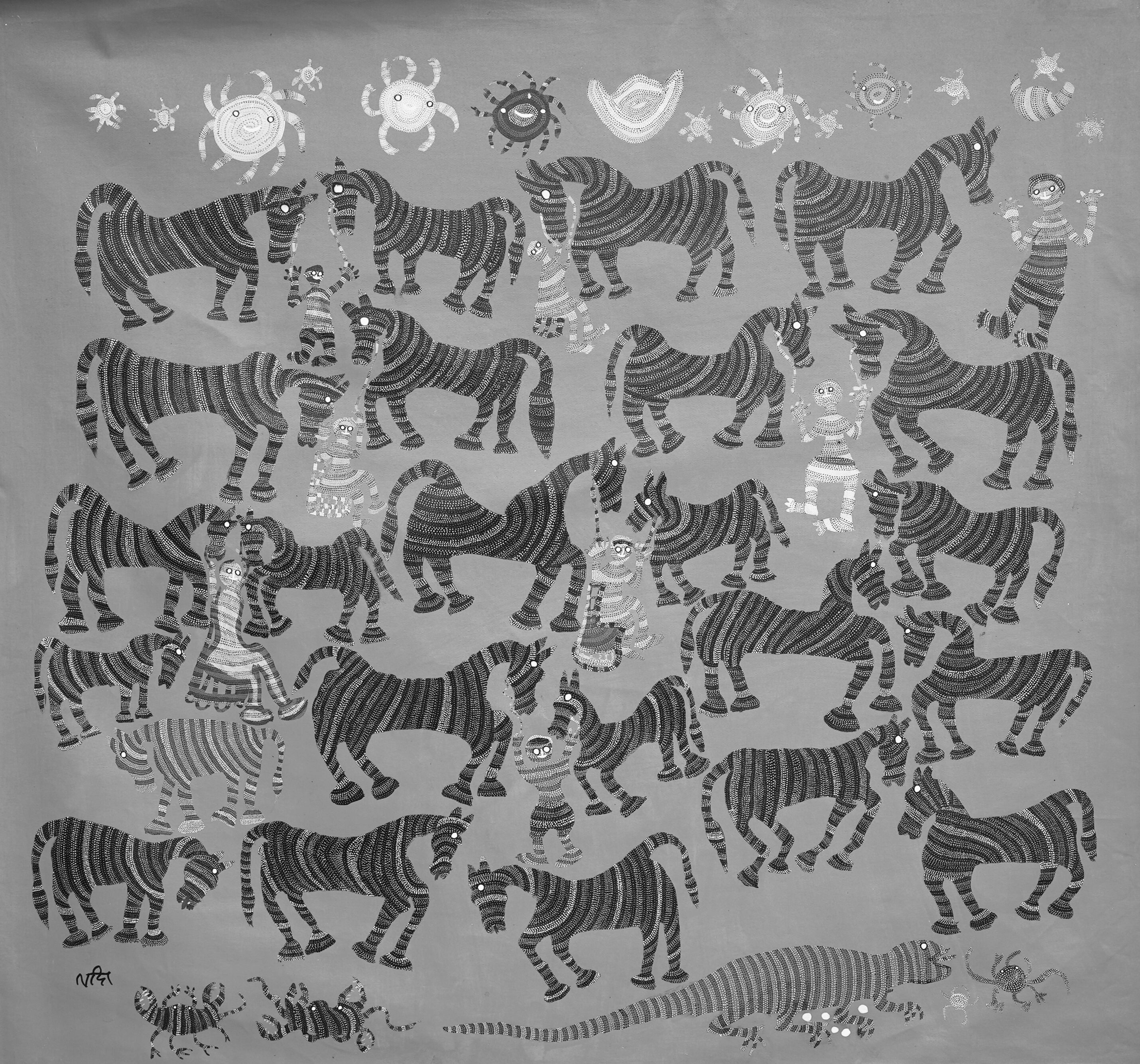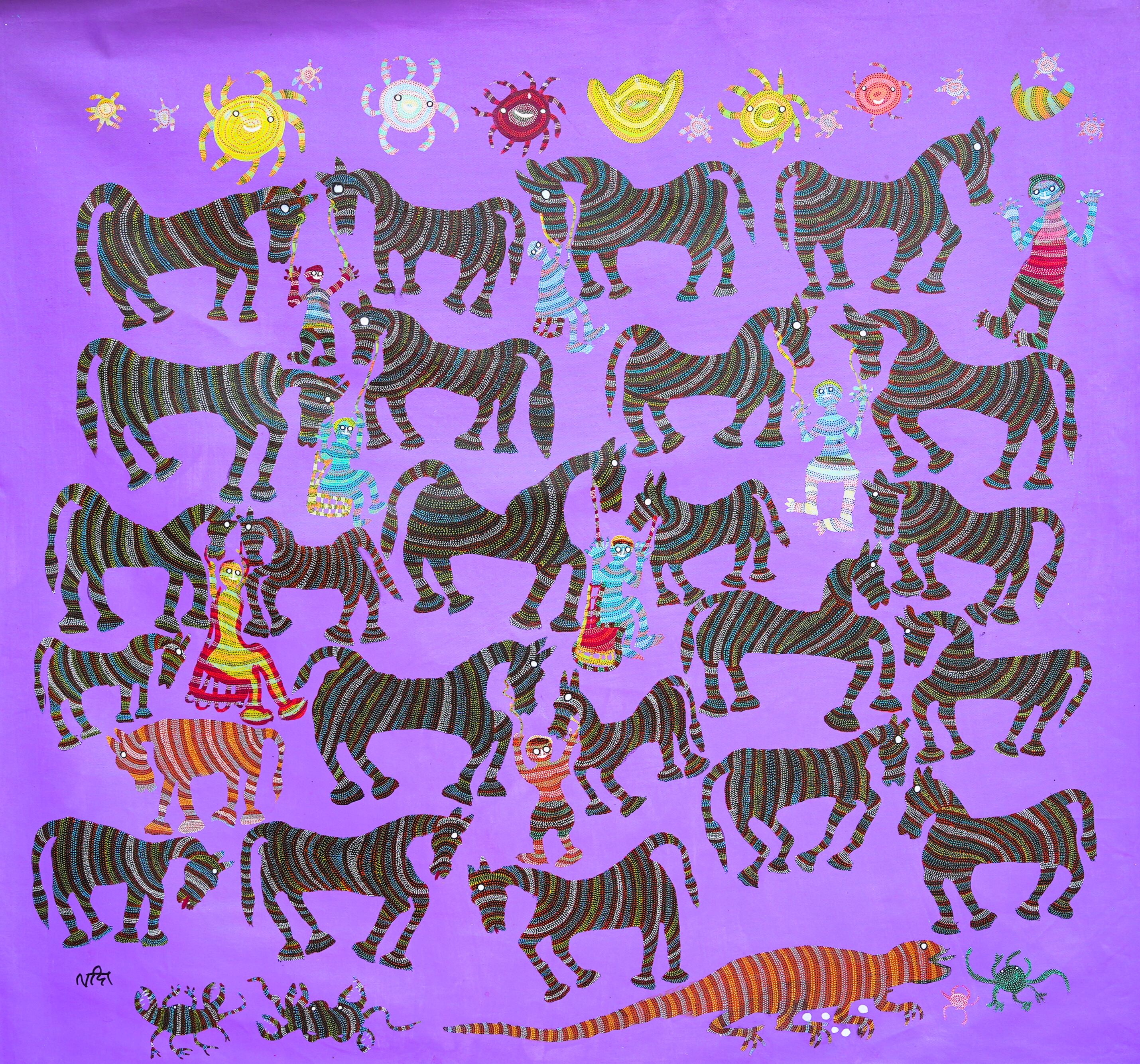 Lado Bai’s work is characterized by the dominance of animism and nature based themes. Spirituality, local traditions and rituals also find their place in her larger than life compositions. Elements of community, environment and strong sense of individualism blend together in harmonious, bold shades, replete with thousands of dots - an essential element of Bhil paintings. However, unlike other paintings these dots play a special role in setting Lado Bai’s work apart i.e. these dots set in a wave like or zig-zag manner give the illusion of movement. In Lado bai’s paintings, figures, birds and animals seem to be flying, moving and being life-like on canvas!