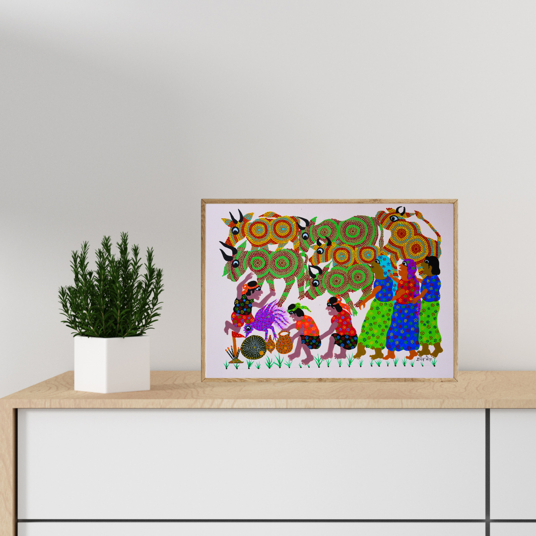 Celebrate the beauty of tradition, devotion, and rural life through ""Govardhan Pooja"" by Sharad Meda, a captivating piece of Bhil tribal art. Rich with cultural symbolism, this artwork brings to life the ritual of Govardhan Pooja (the worship of cows), an important festival in many Indian communities that honors cows and nature’s bounty. In Bhil tradition, cows are not only sacred but are also vital to the agrarian way of life nurturing families through sustenance, strength, and spiritual meaning.During this festival next day to Diwali people of the tribe get together to honour their cattle. Vibrant with decorations the worship is offered to the cows who are considered to be an important part of their family.